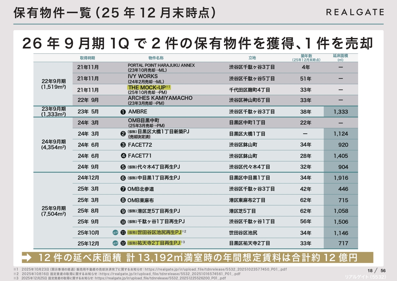 岩本:保有リスト(当決算説明資料P18「保有物件一覧(25年12月末時点)」)のうち、1番および3番から8番です(①、③〜⑧)。6番(⑥)の「中目黒1丁目再生PJ」は竣工していないものの、賃料を既存の入居者から得ている状況ですので、運営中のカテゴリに含まれます。