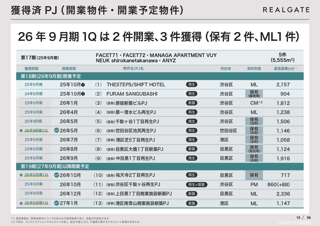 獲得済プロジェクトについてご説明します。2026年9月期第1四半期では、2件の開業と3件の物件獲得が完了しています。スライドに示したとおり、物件が順調に積み上がっています。