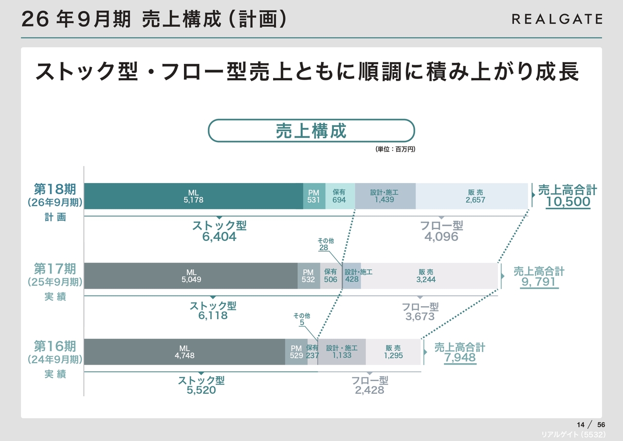 売上構成です。ストック型およびフロー型ともに、売上が順調に積み上がる見込みです。