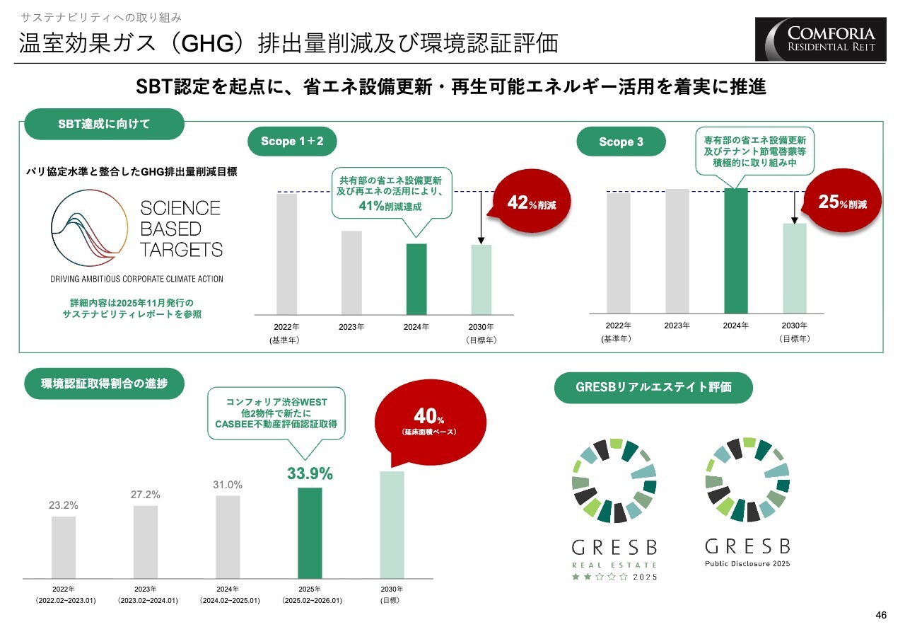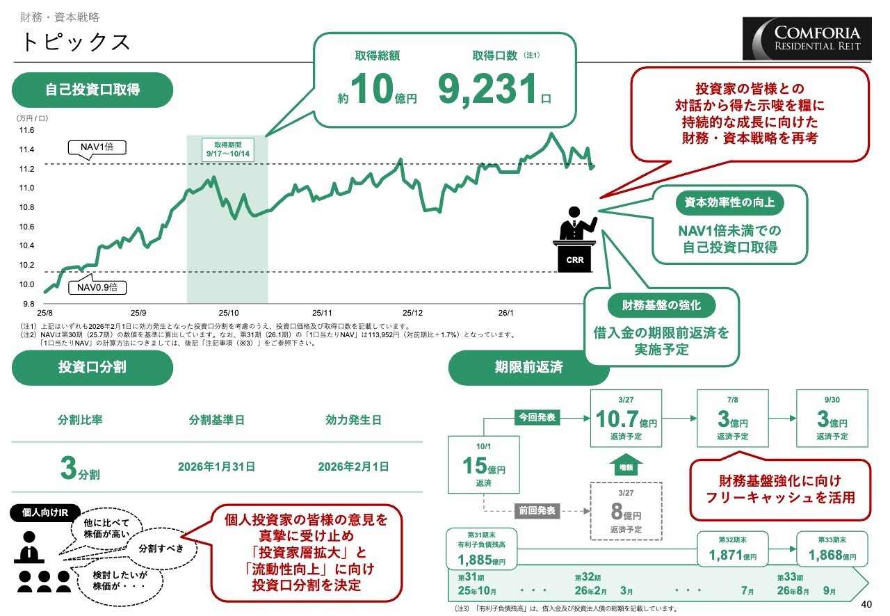 また、本年2月から投資口を3分割することで、個人投資家の意見を反映させ、投資家層の拡大と流動性の向上を目指していきます。LTVと金利負担を意識した期限前返済については、前回の発表より額を増やし、引き続き実施していく予定です。