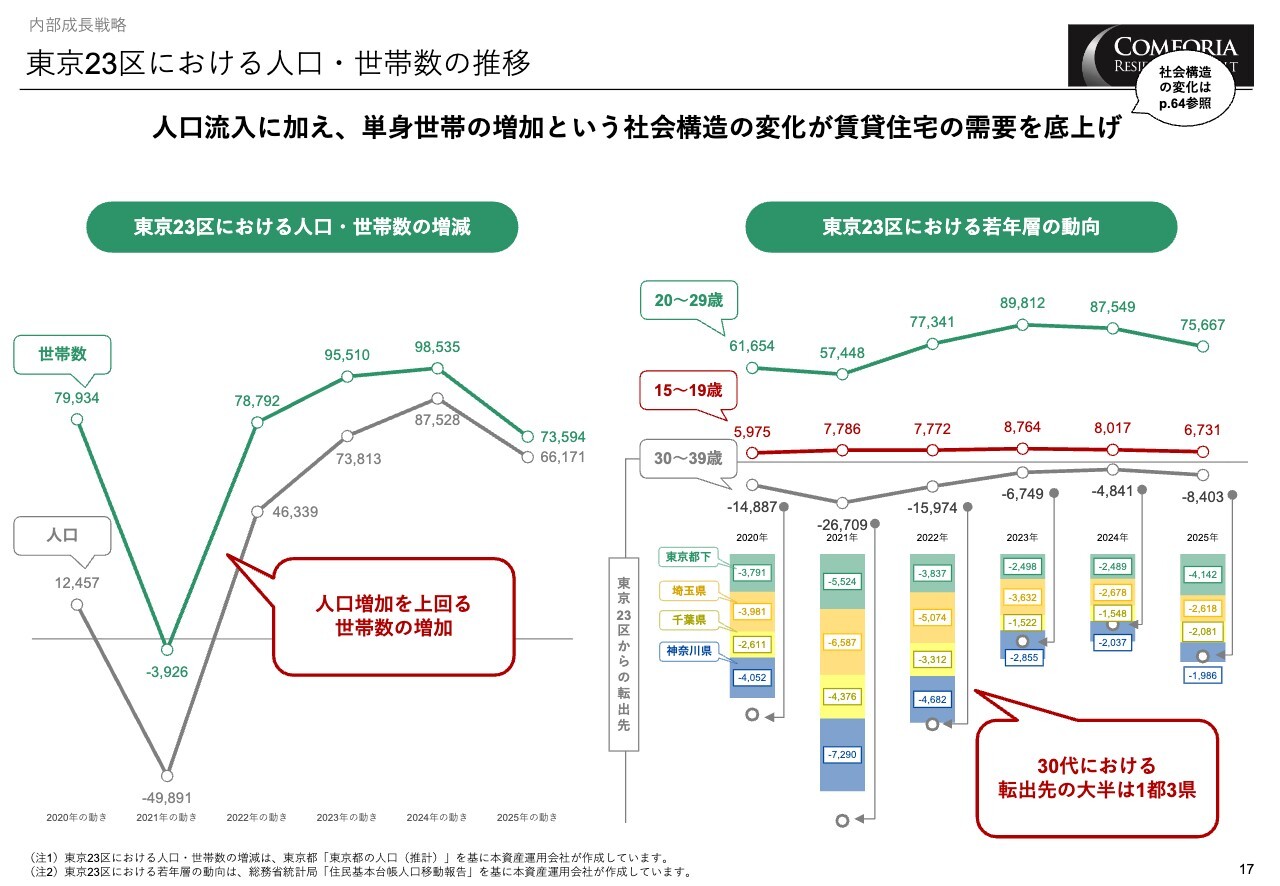 東京23区における優位性についてご説明します。東京23区では、人口流入に加えて単身世帯の増加という社会構造の変化が賃貸住宅の需要を底上げしています。