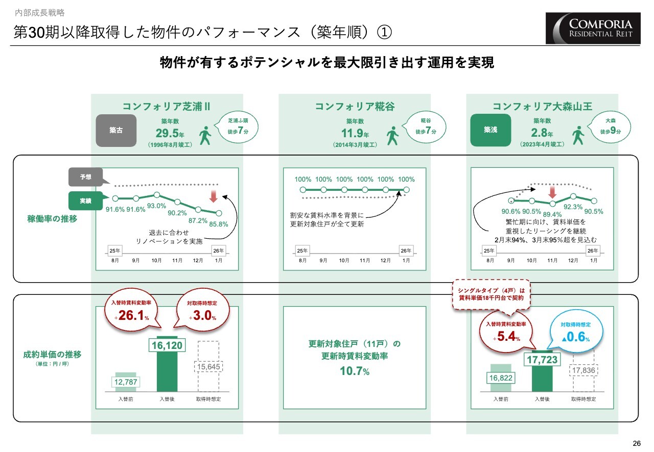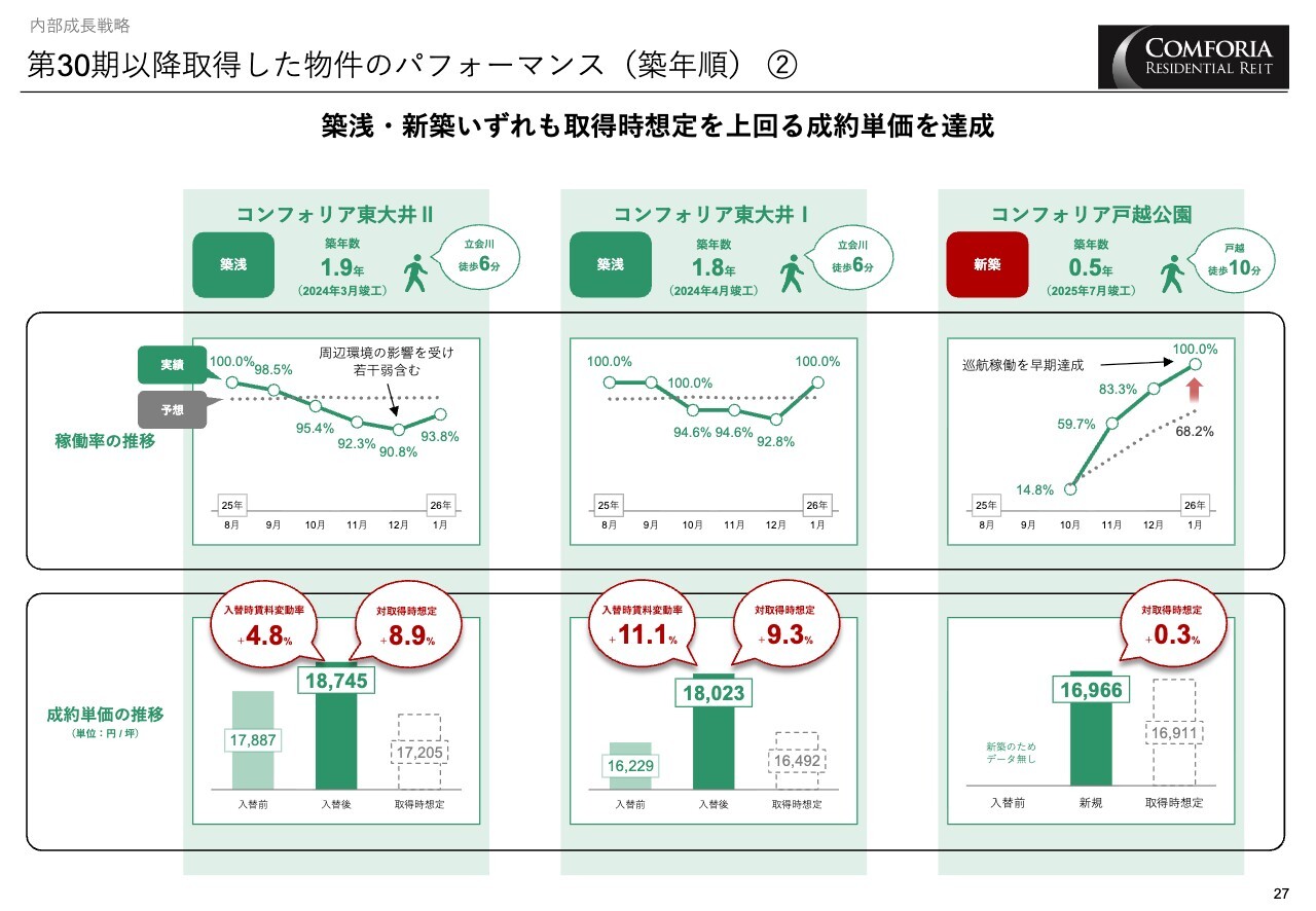 スライドの3物件は築浅および新築であり、取得時に想定していた賃料を上回る成約単価を達成しています。