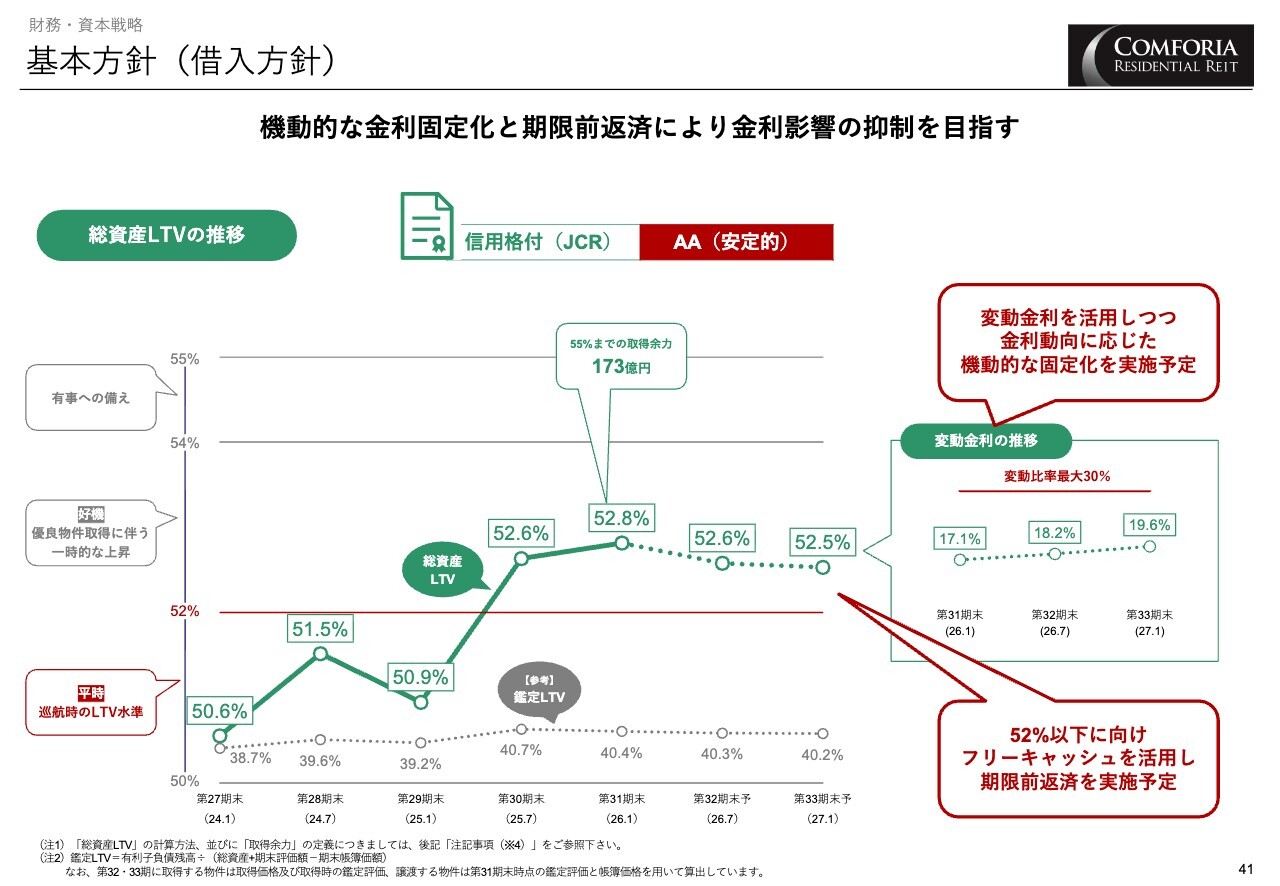 LTVの考え方です。巡航時のLTV水準上限と考えている52パーセント以下を目指し、期限前返済を予定しています。また、変動金利比率を活用しながら、金利動向に応じた機動的な固定化を推進する方針です。