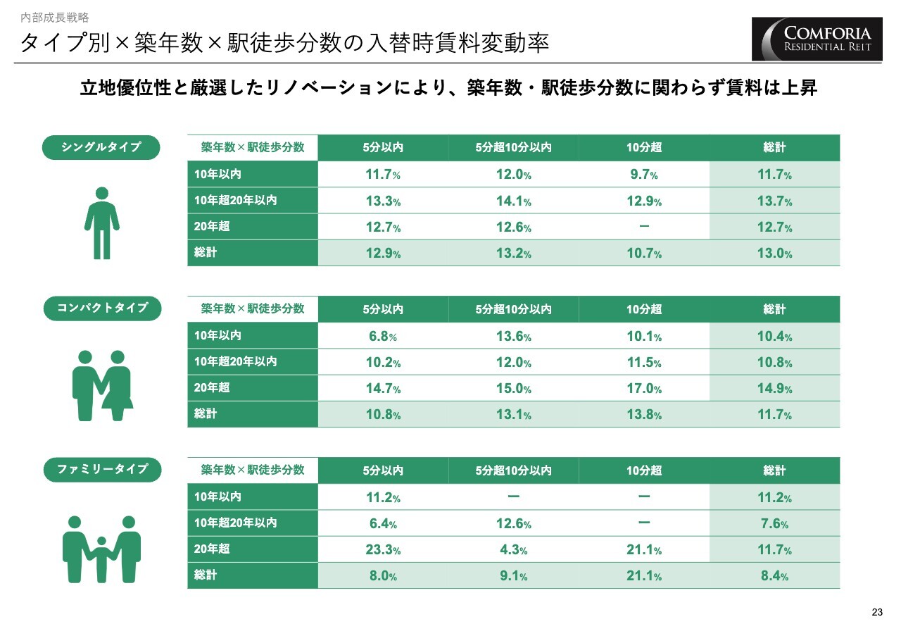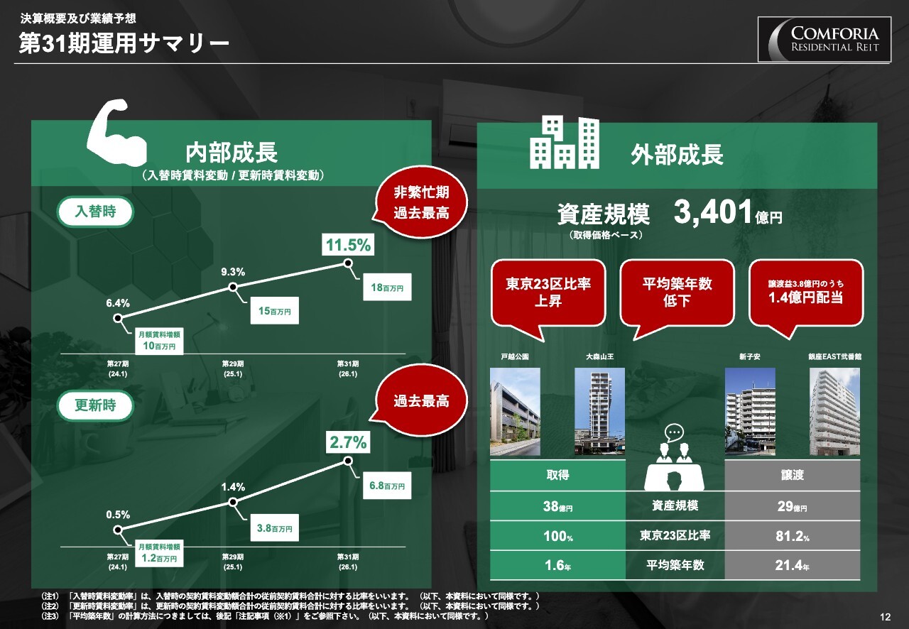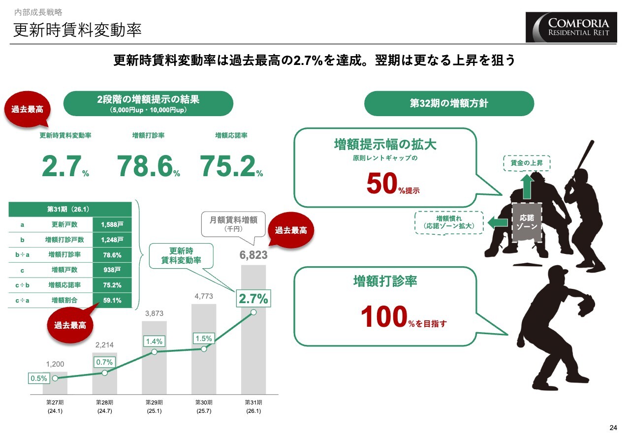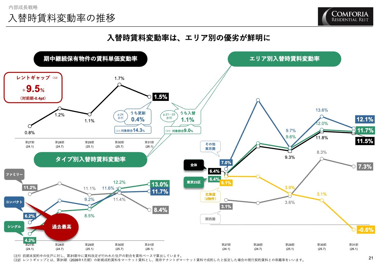 スライド左側の「内部成長」をご覧ください。ポートフォリオ全体の入れ替え時の賃料変動率は11.5パーセントと、非繁忙期として過去最高値を更新しました。また、更新時の賃料変動率も2.7パーセントと、こちらも過去最高となっています。