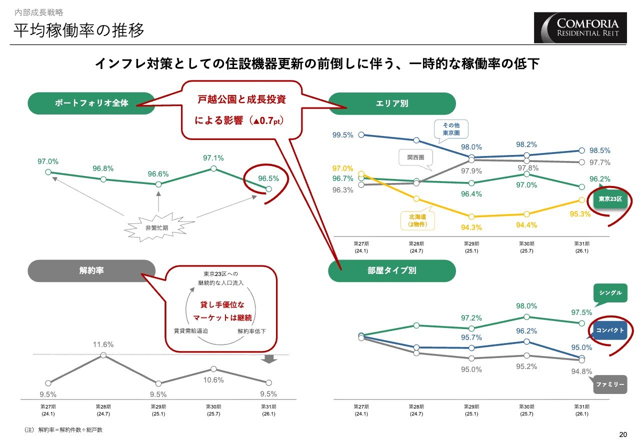 内部成長の各KPIについてです。平均稼働率はインフレ対策として住宅設備機器の更新を前倒しで進めた結果、一時的に低下し、96.5パーセントとなりました。一方、解約率は非繁忙期との比較で変化はなく、一定の入れ替わりが発生する状況が続いています。