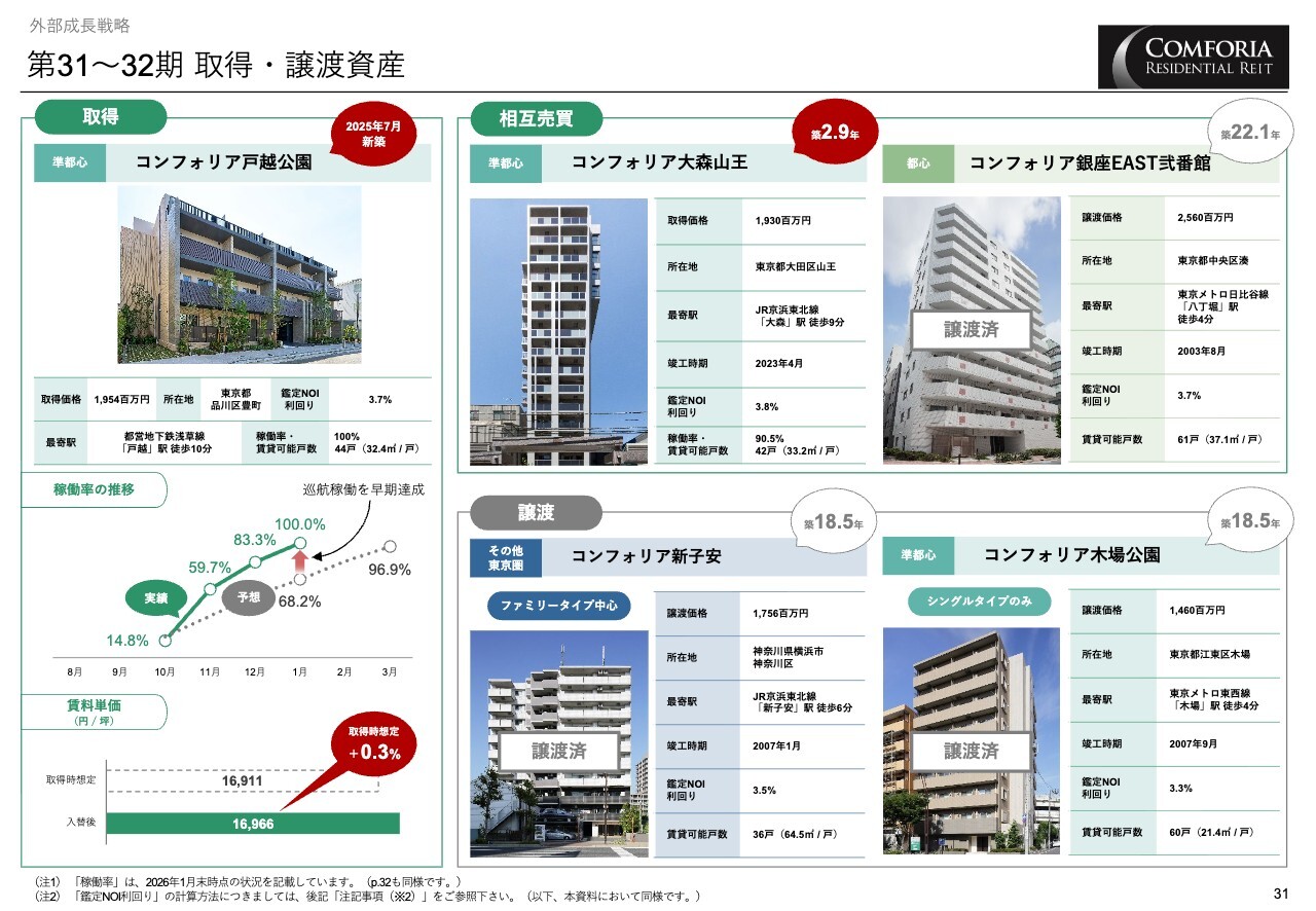 31ページに記載の物件は、第31期から第32期にかけて取得および譲渡した物件です。成長力が劣後する物件を手放し、新築や築浅で将来の成長が期待される物件に入れ替えを行っています。