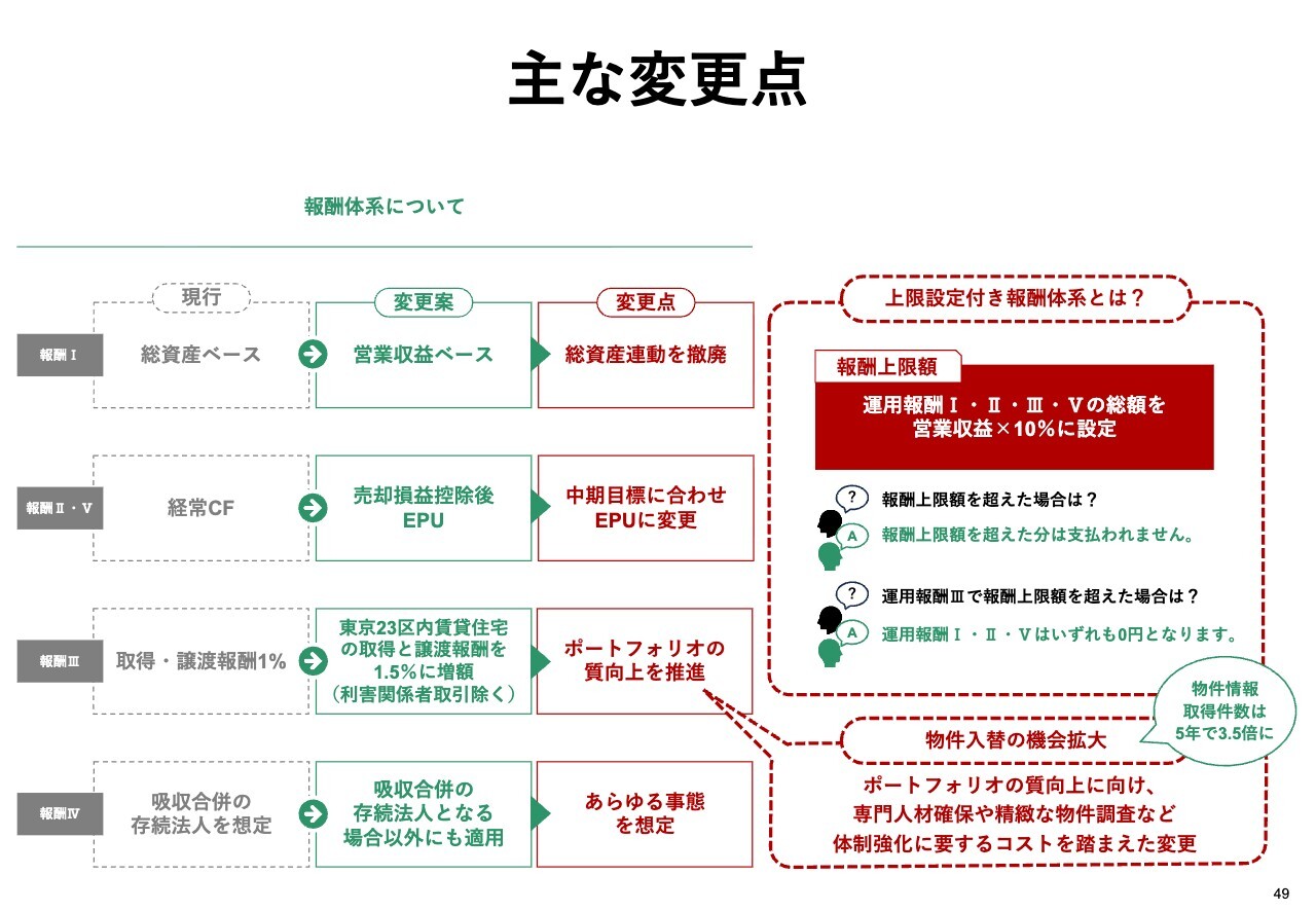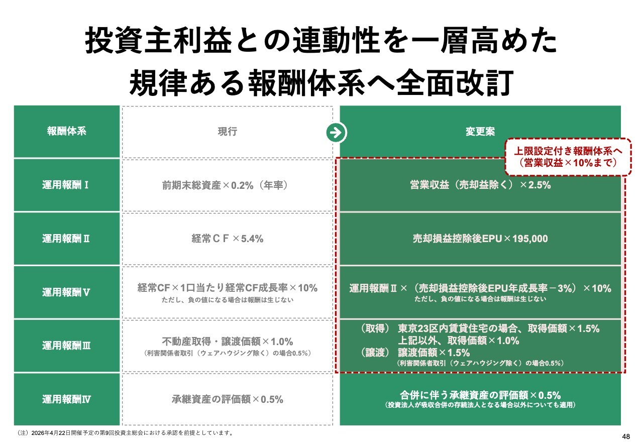 最後に、4月の投資主総会で資産運用報酬の変更を予定しています。投資主利益との連動性をさらに高めた、規律ある報酬体系への全面改定を行います。具体的な算式については、こちらのスライドに記載しています。