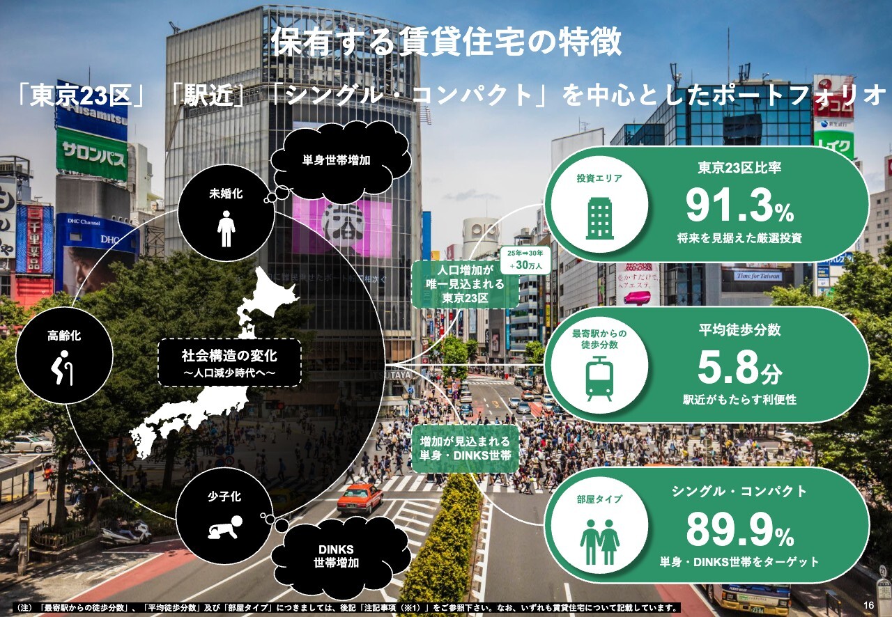 まず、東京23区比率が91.3パーセントと高いこと、駅からの平均徒歩分数が5.8分と近いこと、そして世帯増加が見込まれるシングルタイプ・コンパクトタイプの比率が89.9パーセントと高いことの3点が挙げられます。