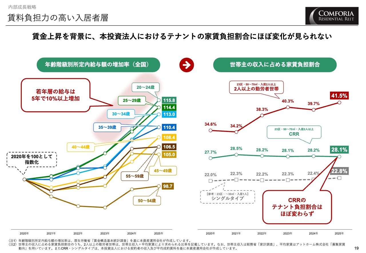 高い賃金上昇を背景に、「コンフォリア」のコンパクトタイプ・ファミリータイプの入居者の世帯年収に占める家賃の割合は28.1パーセントと従来とほぼ変わらず、東京23区のデータより低くなっています。