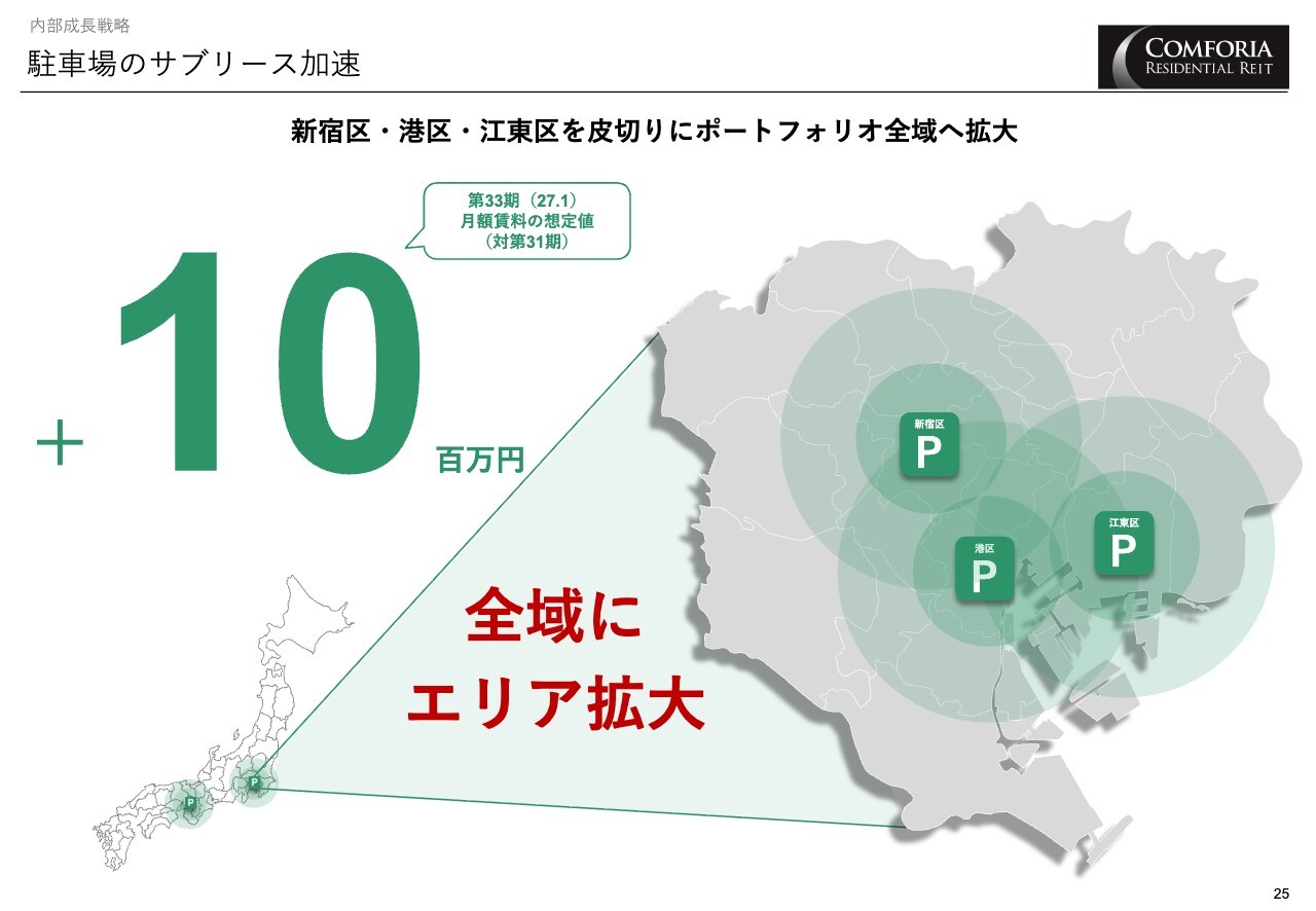 付帯収入増加を目的に取り組みを開始した駐車場のサブリース化については、ポートフォリオ全域へ拡大し、今後の内部成長に寄与していきます。