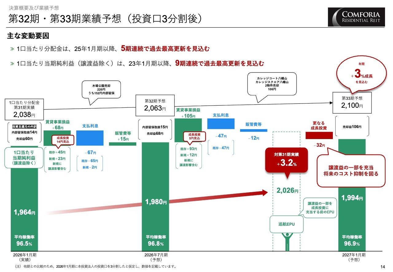 まず、第32期は繁忙期という季節要因の影響を受けず、既存物件でのプラスを取り込むことで、EPU・DPUともに前回の開示を上回る水準を予想しています。第33期は一定額の成長投資を見込み、巡航EPUは2,026円、年成長率はプラス3.2パーセントを見込んでいます。