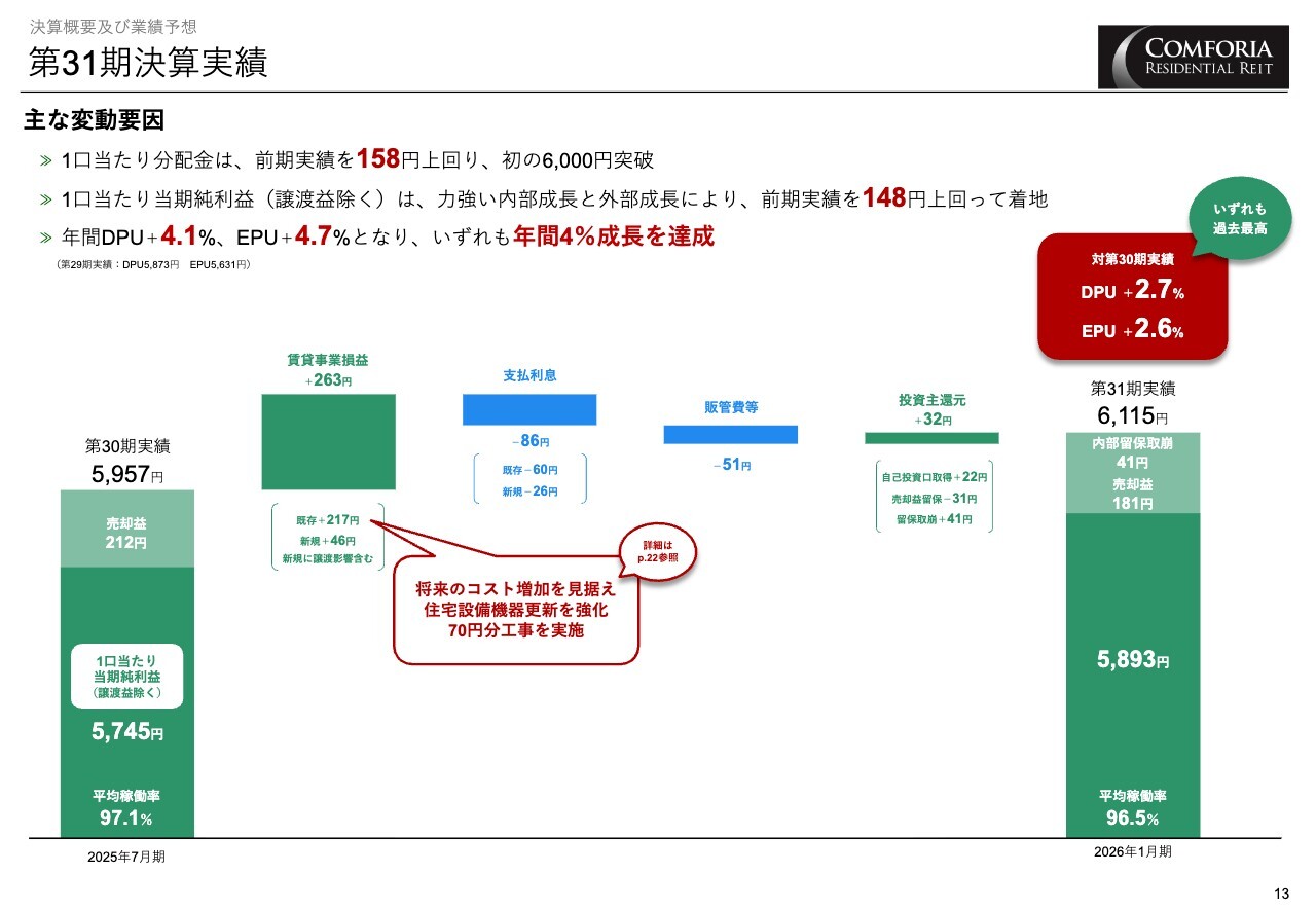 決算実績についてご説明します。既存物件の伸びに加えて新規取得物件の寄与もあり、成長投資の一環として住宅設備機器の更新を一定程度行った結果、EPUは前期比プラス2.6パーセント成長と、予想を上回る結果となりました。
