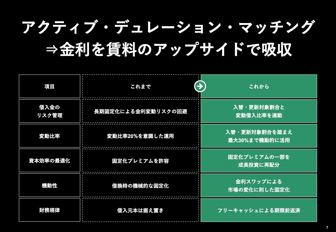 入替や更新などで賃料変動が生じる割合に応じて、変動借入比率を最大30パーセントまで機動的に活用します。そこで生じた固定化プレミアムの一部を成長投資に再配分し、金利スワップを活用して市場変化に応じた固定化や期限前返済を行う手法です。