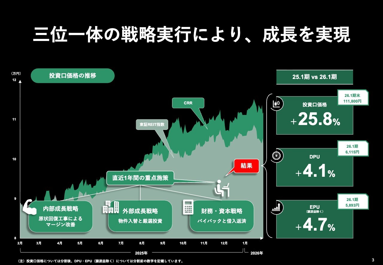 直近1年間で、内部成長戦略ではマージンの改善、外部成長戦略では物件入替と厳選投資、財務・資本戦略ではバイバックと借入返済を実行し、これら三位一体の戦略を通じて、投資口価格、DPU、EPUの成長を実現してきました。