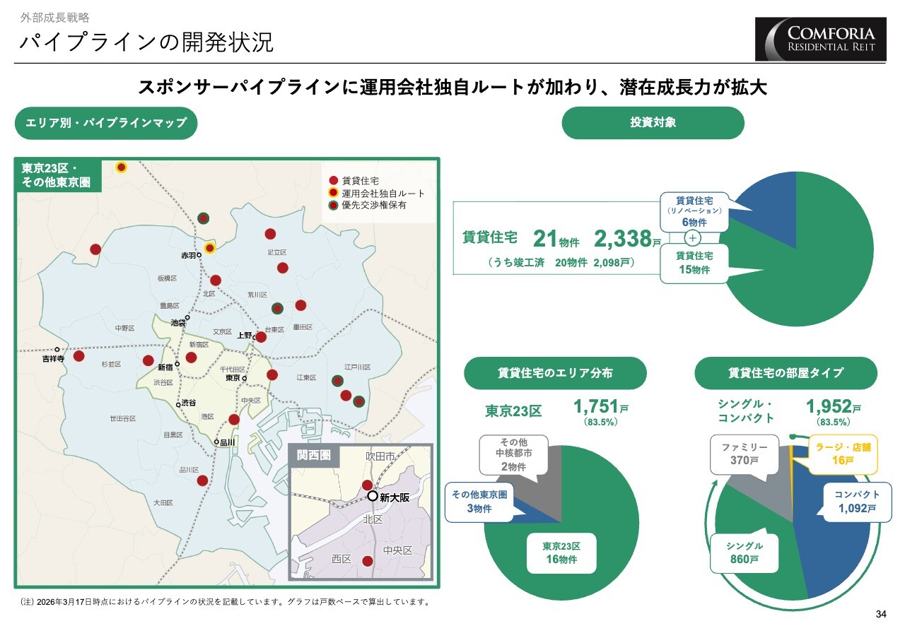 パイプラインの状況です。スポンサーパイプラインに運用会社独自ルートを加え、合計21物件のパイプラインを有しています。今後はタイミングを見計らい、取得を進めていきます。