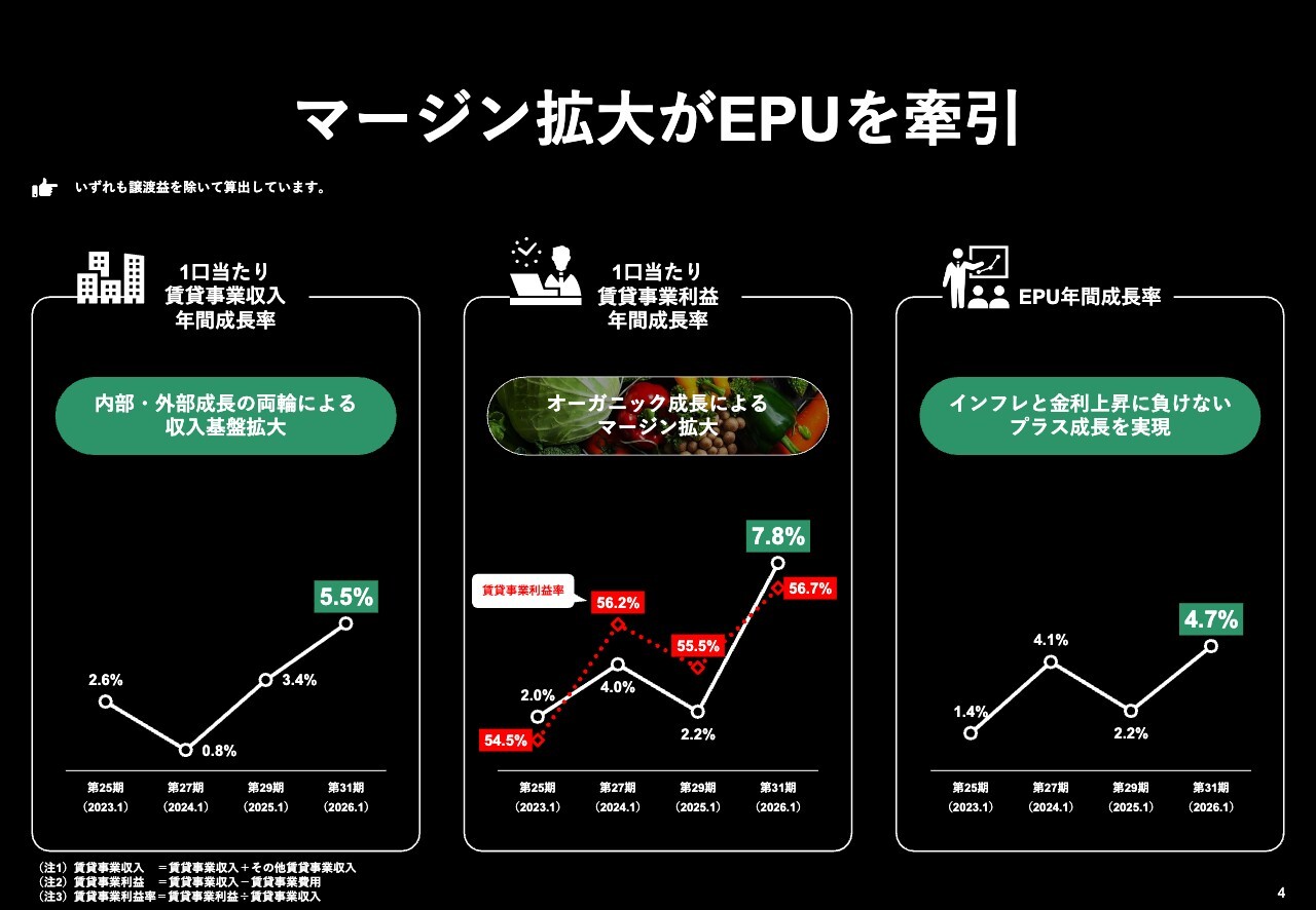 スライド左側は1口当たりの賃貸事業収入の年間成長率、中央は1口当たりの賃貸事業利益の年間成長率、右側はEPUの年間成長率を示しています。マージンの拡大がEPU成長を牽引している状況をご理解いただけるかと思います。