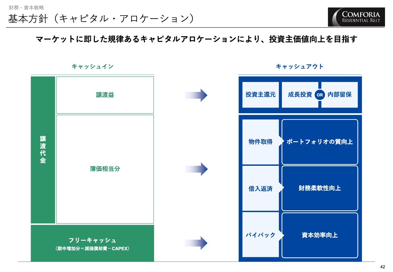キャピタル・アロケーションについてです。物件売却により生じた譲渡益は、投資主への還元を行うとともに、成長投資または内部留保とし、残りのキャッシュは手元資金も含めてマーケットを見ながら規律あるアロケーションを行うことで、投資主価値の向上を目指していきます。