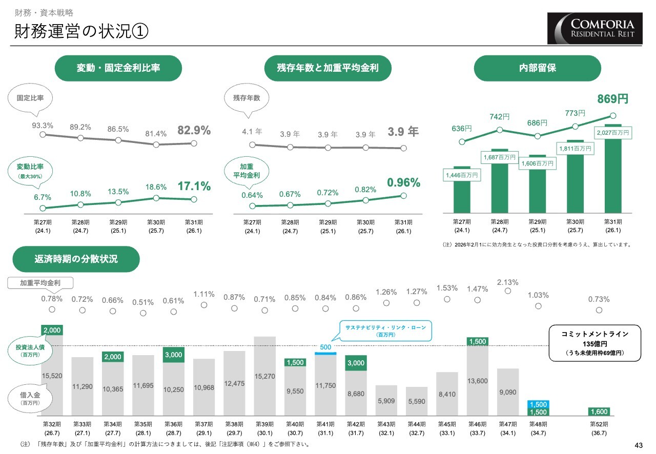 財務の各指標です。第31期末における変動金利比率は最大30パーセントの上限のうち17.1パーセント、残存年数は3.9年、加重平均金利は0.96パーセントとなっています。