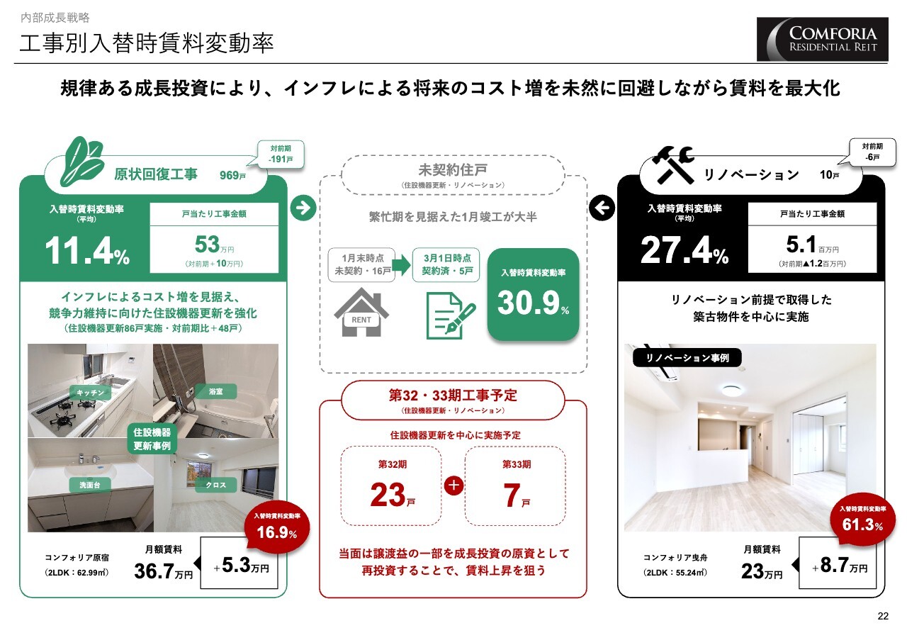 工事別入替時賃料変動率です。原状回復工事実施に際しては、住設機器の更新という成長投資を規律をもって推進し、インフレに伴う将来の工事コスト増を未然に回避しながら、賃料の最大化を図っています。