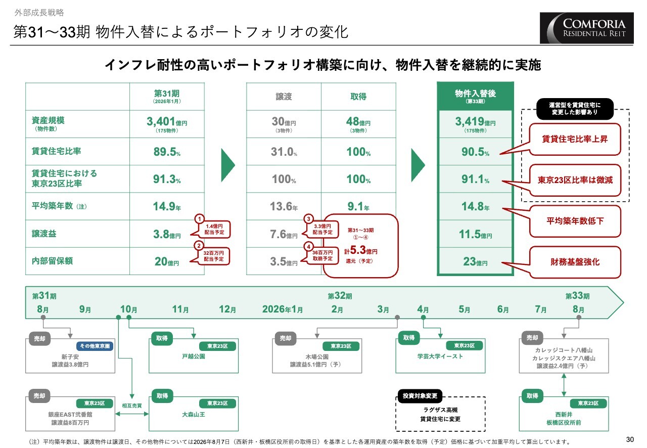 ここからは、外部成長についてご説明します。このスライドでは、第31期から第33期にかけての物件入替に伴うポートフォリオの変化をまとめています。