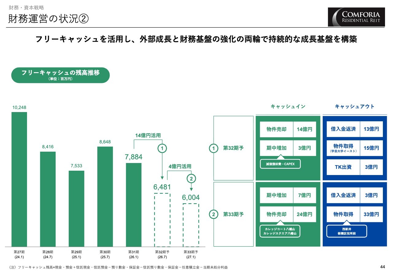 フリーキャッシュの活用状況についてです。第32期には14億円、第33期には4億円を活用し、借入金返済による財務基盤の強化と物件取得による成長への再投資の両輪で、持続的な成長基盤を構築していきます。