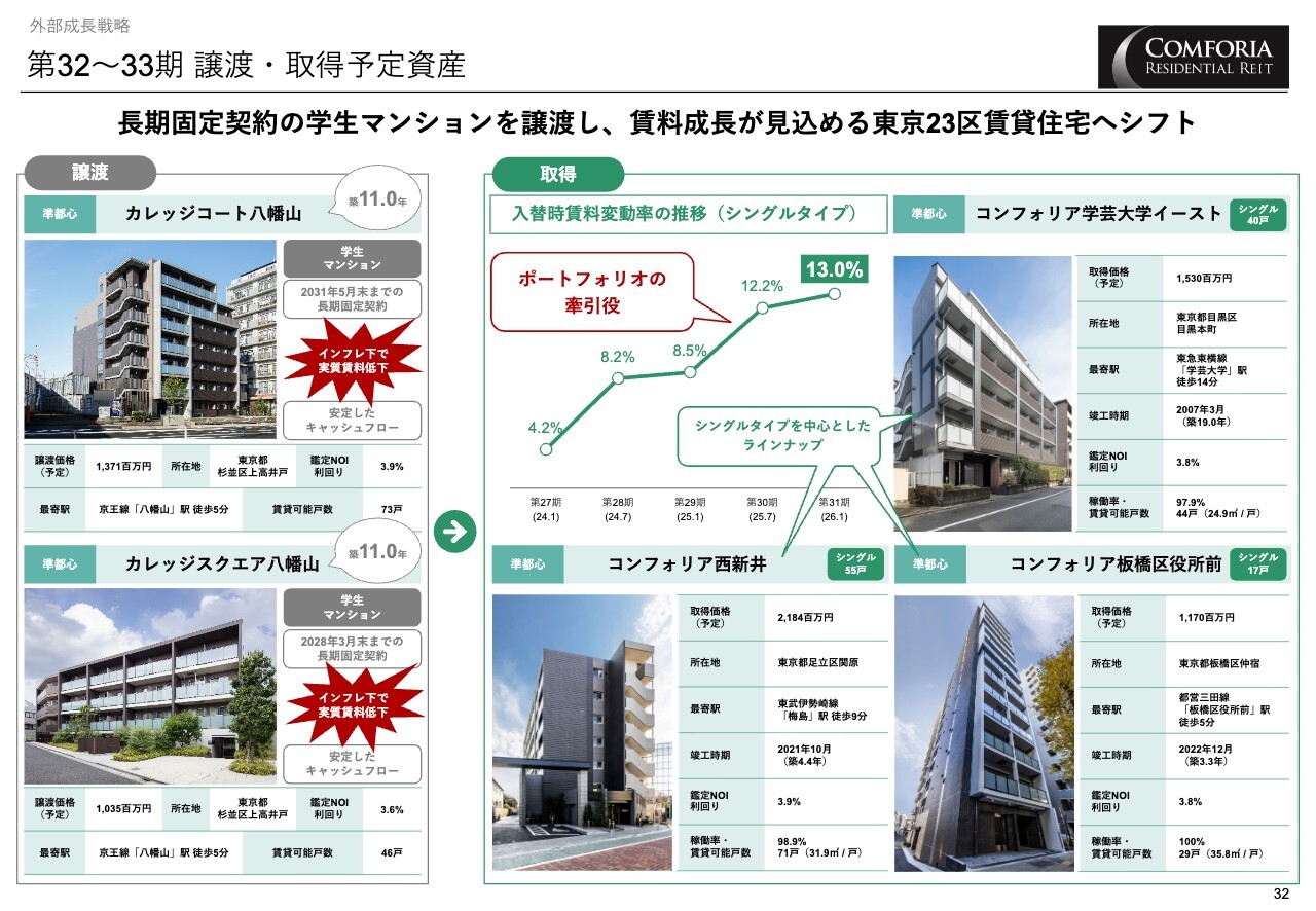 次に、第32期から第33期にかけて予定している物件です。固定賃料型の学生マンションを譲渡し、賃料成長が見込まれる東京23区の賃貸物件へシフトします。
