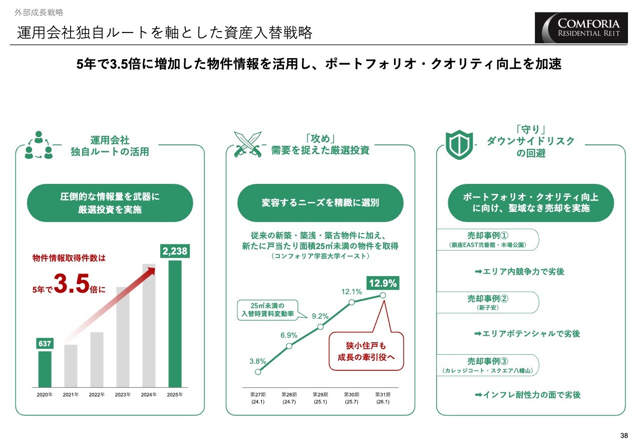 その情報を活用し、ニーズの変化を迅速に捉えた攻めの物件選別と、ダウンサイドリスクを回避するための聖域なき売却によって、ポートフォリオ・クオリティの向上を実現しています。