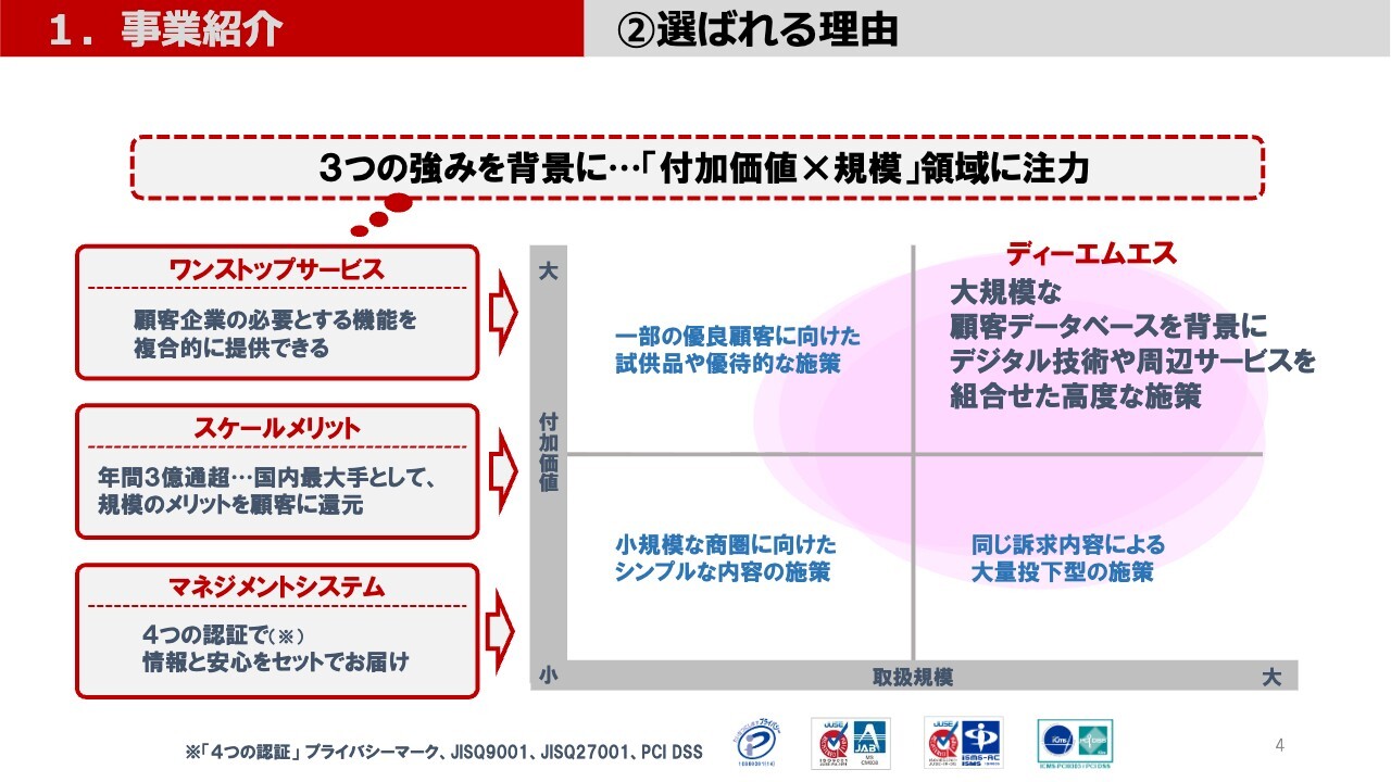 当社の強みは大きく3つです。顧客企業の必要とする機能を複合的に提供できる「ワンストップサービス」、年間3億通を超えるダイレクトメールを扱う「スケールメリット」、品質や情報セキュリティのJIS認証を持ち、情報と安心をセットでお届けできる「マネジメントシステム」です。
