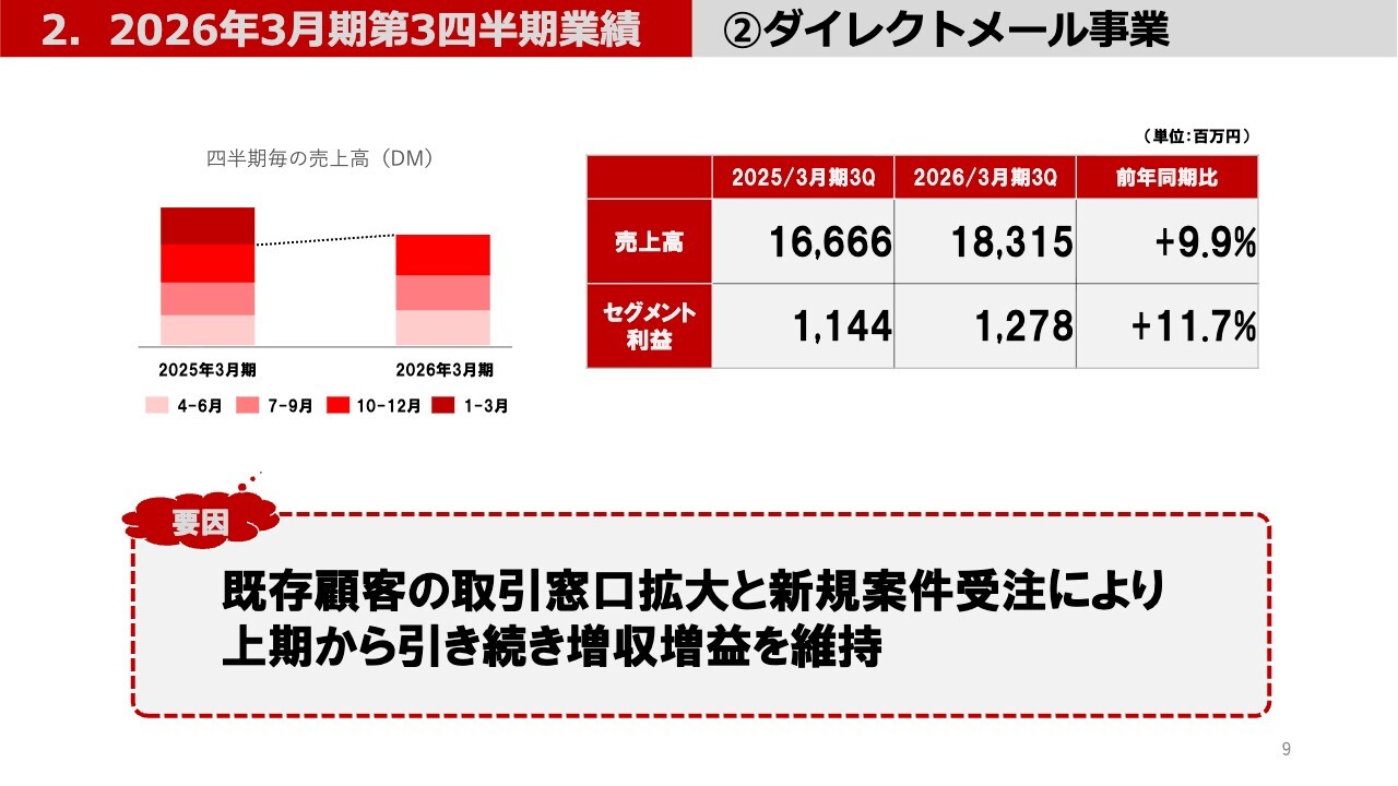 事業セグメントごとに業績とその要因をご説明します。まず、ダイレクトメール事業では、既存顧客の取引窓口拡大や新規受注促進が奏功したことで、上期から引き続き増収増益となりました。