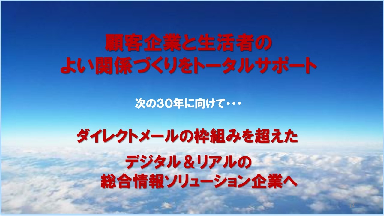 そして、これらの活動の先に、従来のダイレクトメールの枠組みを超えた「総合情報ソリューション企業」としてのありたい姿を描いているところです。
