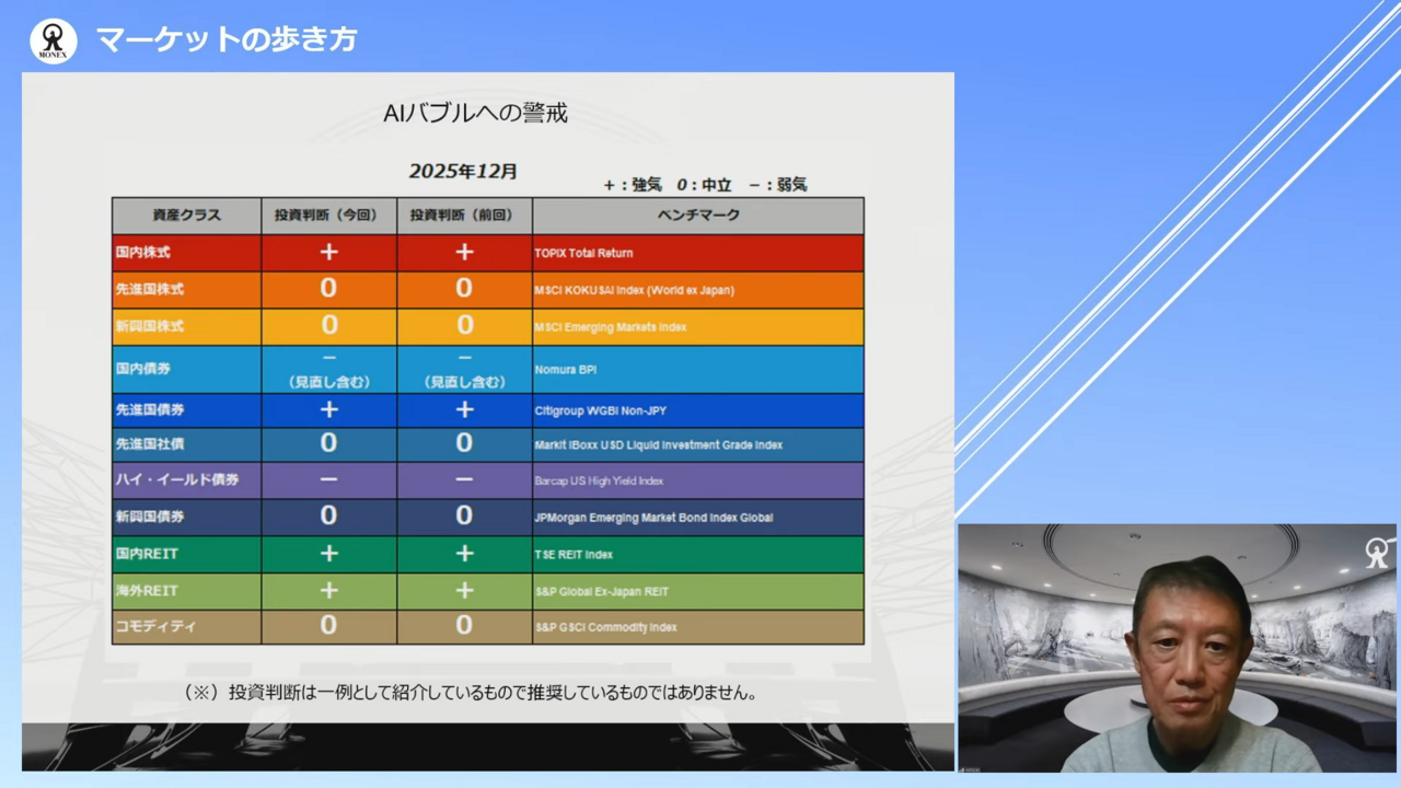 広木隆氏:マネックス証券の広木隆です。2025年12月になりました。今年最後の「月刊マーケットの歩き方」を始めます。資産の評価、ウェイトなどは変えていません。今回のポイントは、AIバブルへの警戒です。