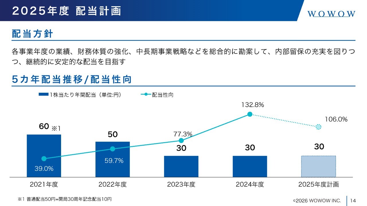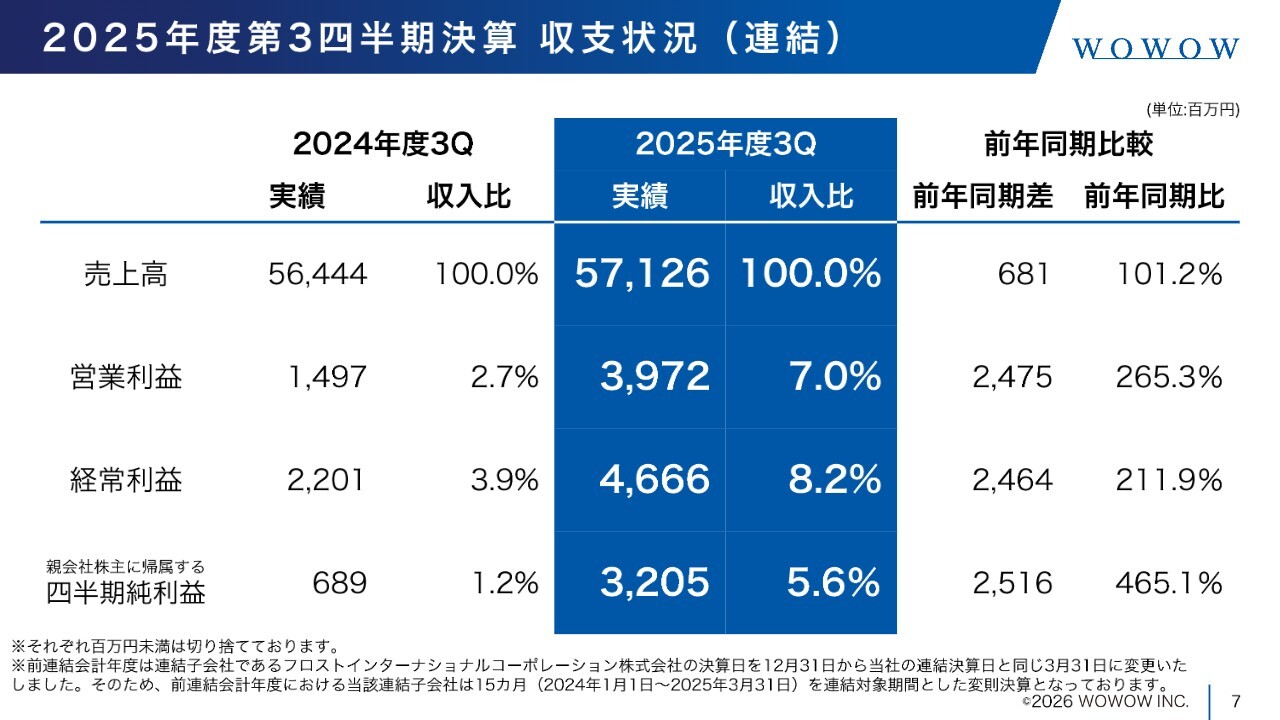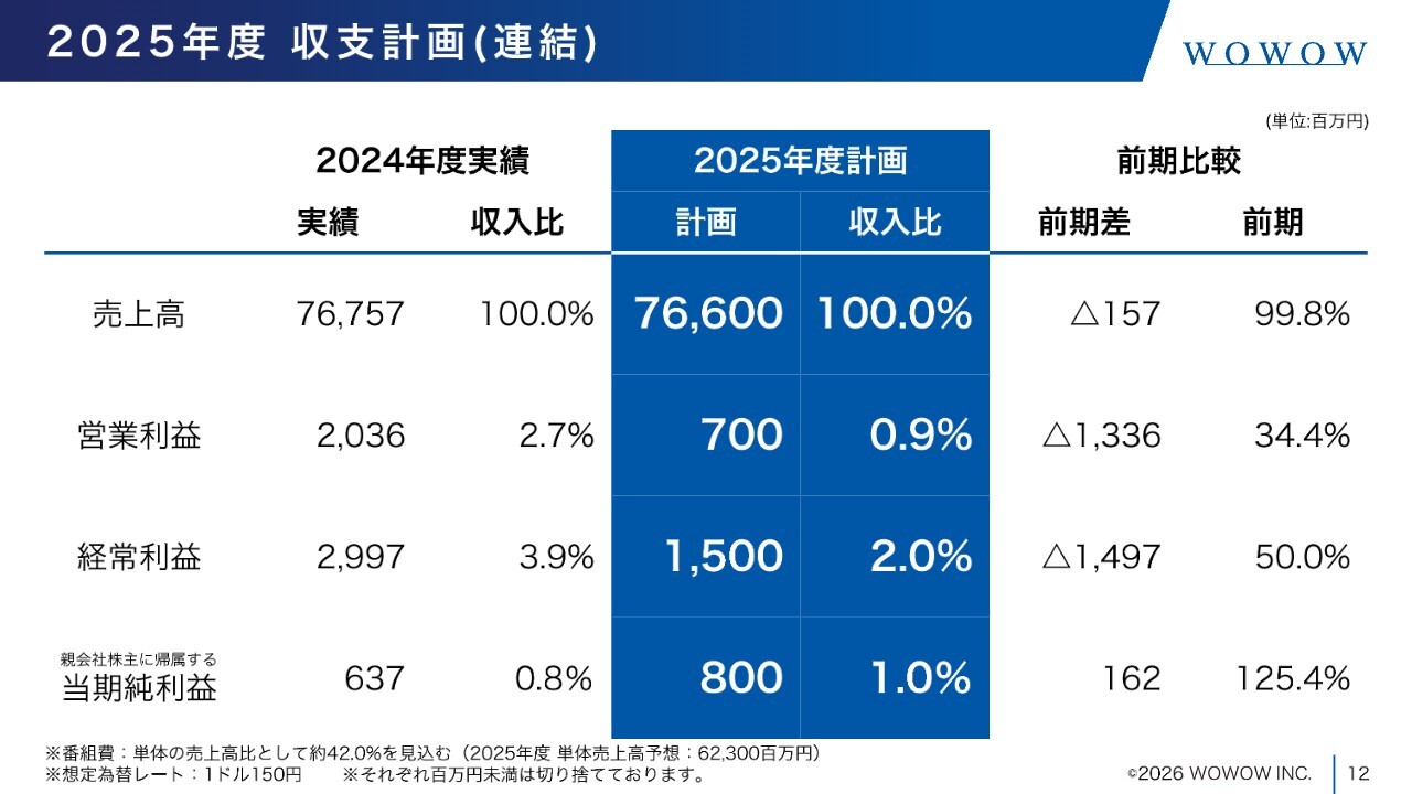山本:あらためて、本日は決算説明会にご参加いただき、誠にありがとうございます。WOWOWは1991年4月1日に開局しました。今年2026年は、開局35周年を迎える年です。本年はなんとしても、先ほどご紹介したフラッグシップコンテンツである連続ドラマ「北方謙三 水滸伝」、WOWOW FILMS『ゴールデンカムイ 網走監獄襲撃編』の2つを大成功させて、良い35周年になるように成功のスタートを切りたいと思っています。映画をご覧いただき、ヒットの一翼に貢献していただけると幸いです。
