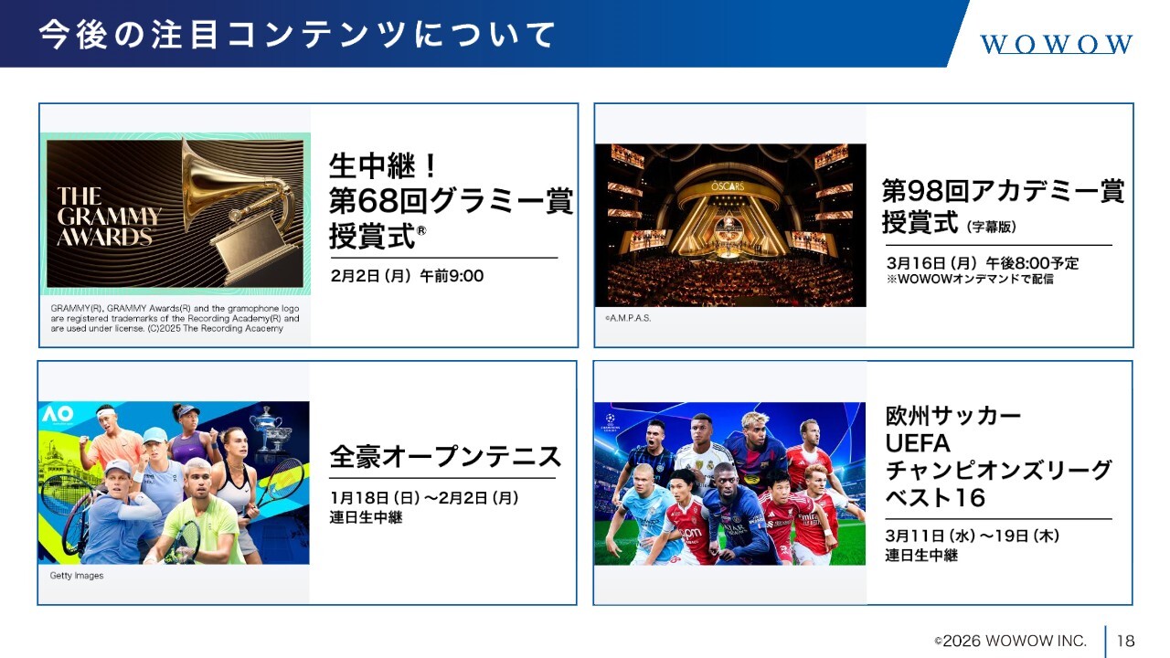 今後の注目番組についてです。2月2日月曜日より開催される第68回グラミー賞授賞式を、アメリカロサンゼルスより独占生中継します。また、『国宝』のノミネートで注目されている第98回アカデミー賞授賞式も、授賞式当日の夜に配信にてお届けします。