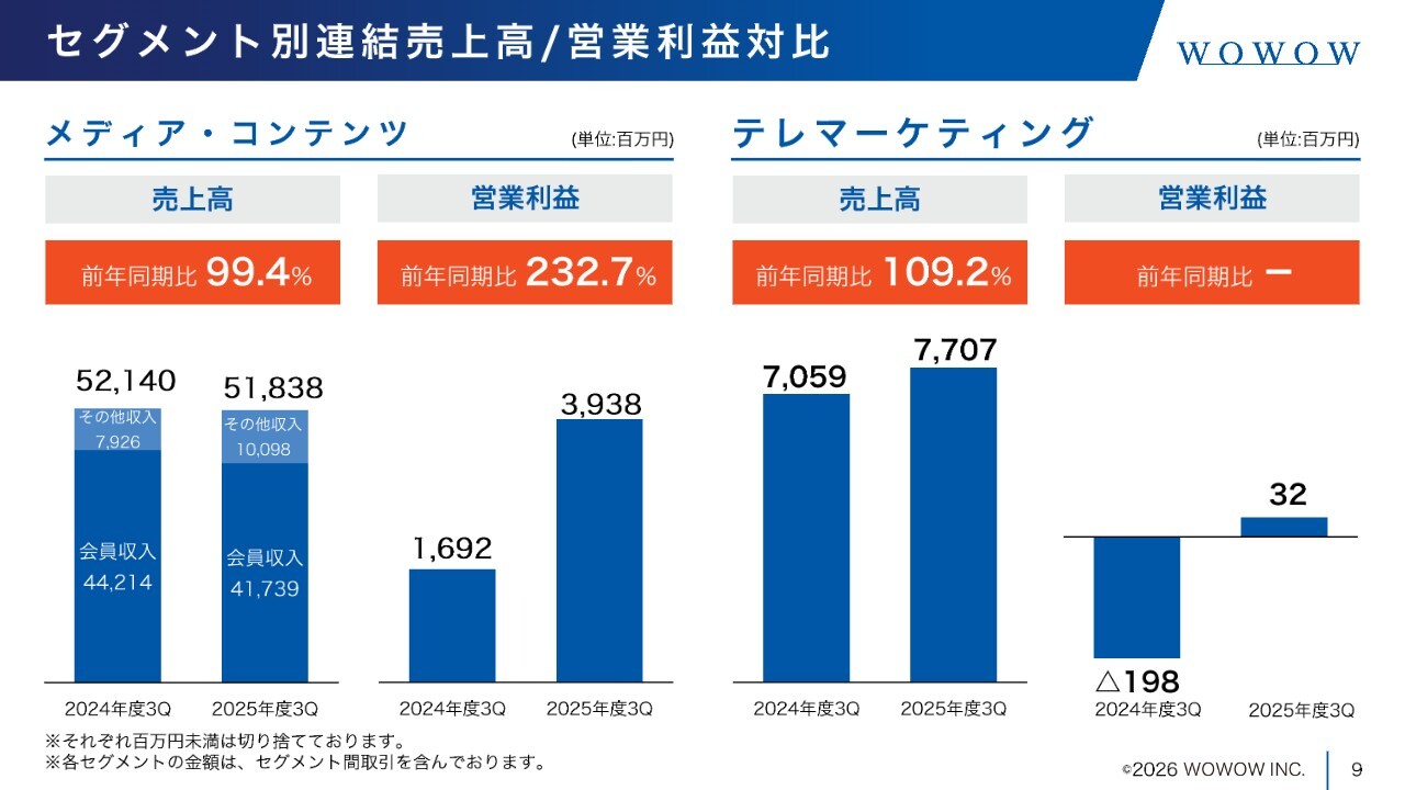 セグメント別の状況です。まずメディア・コンテンツセグメントです。お客さまからいただく会員収入が売上高の多くを占めています。売上高は会員収入以外の事業収入など、その他収入は増加しましたが、会員収入の減少をカバーできず、3億200万円の減収となりました。営業利益は番組費などの費用が前年同期より減少したことなどにより、22億4,600万円の増益となりました。