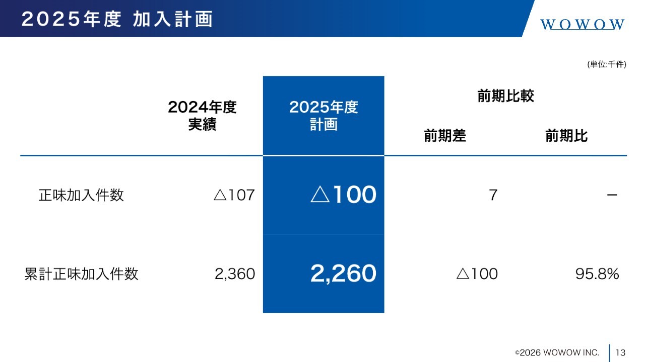 第3四半期の時点で正味加入件数がマイナス14万8,000件となっていますが、「LPGA女子ゴルフツアー」の終了などによる解約はある程度想定しており、後ほどご説明するコンテンツのプロモーションを強化し、「WOWSPO」を含め加入を伸ばすことで、年度計画の達成を目指します。