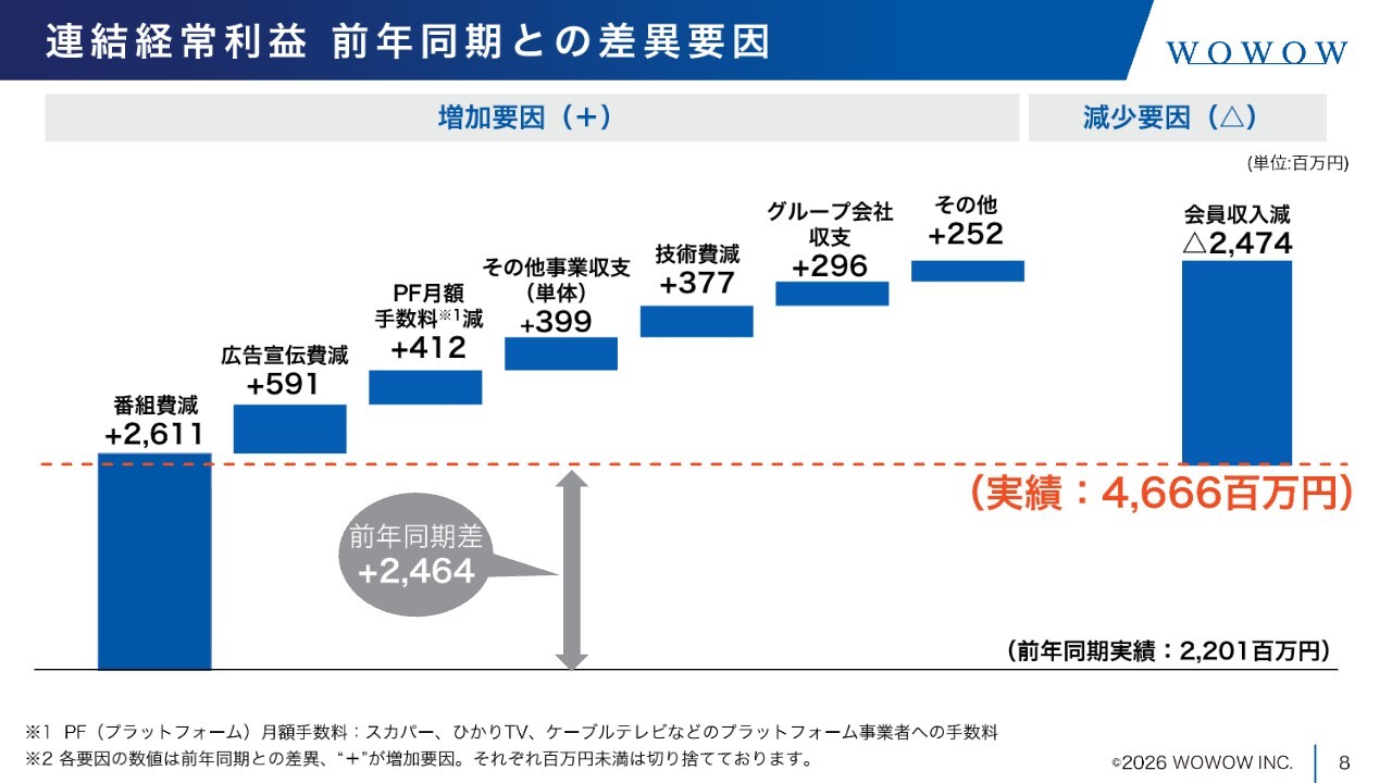 まず、増加要因です。番組費は26億1,100万円減少しました。詳細はこの後にご説明します。広告宣伝費は効果的な投下により5億9,100万円減少し、プラットフォーム事業者への手数料であるプラットフォーム月額手数料は、加入件数の減少などにより4億1,200万円減少しています。