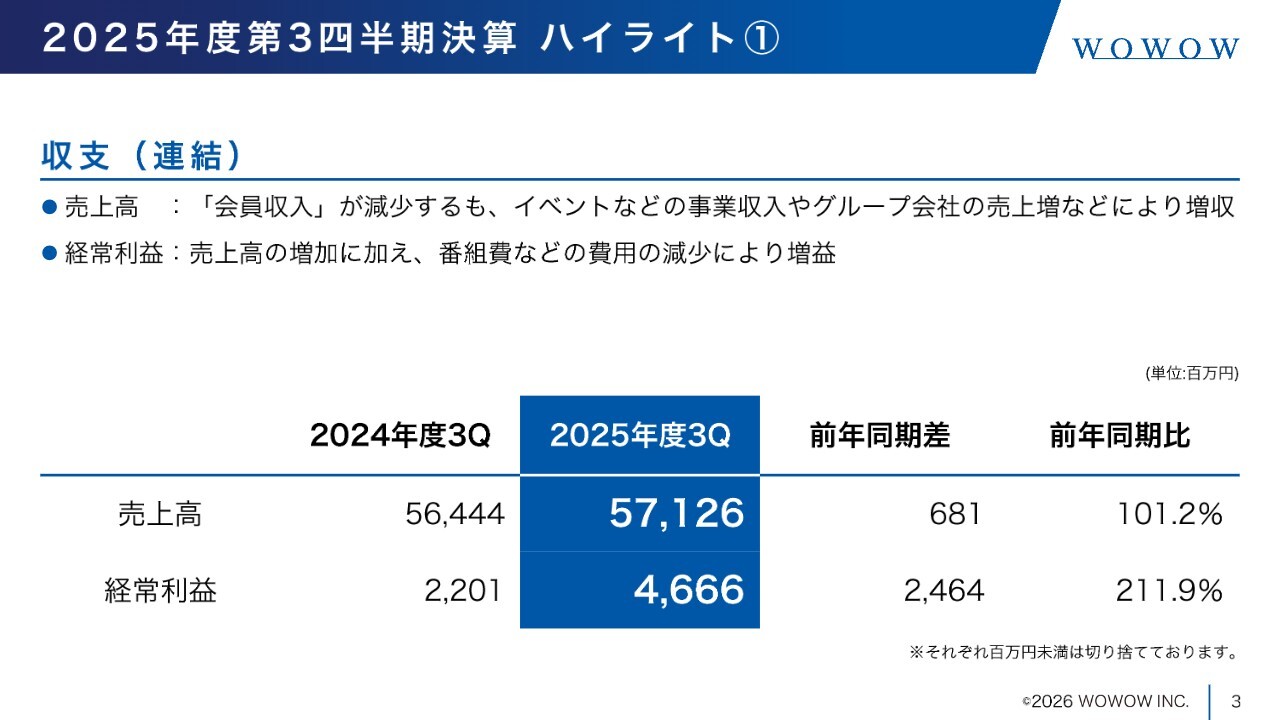 収支のハイライトです。売上高は会員収入の減少などがありましたが、イベントなどの会員収入以外の事業収入や、グループ会社の売上の増加などにより増収となりました。経常利益は売上の増加に加え、番組費などの費用の減少により増益となっています。