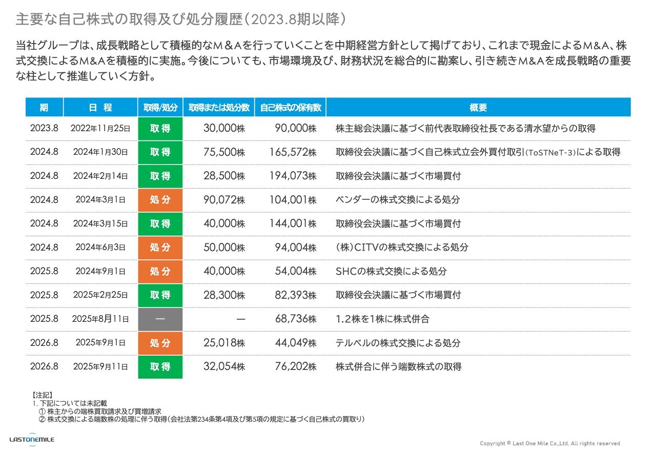 スライドでは、これまで弊社が自社株買いを行っていた株式について、どのように処分しているかを記載しています。そのほとんどはM&Aの際に株式交換に利用しています。また、前期に株式の併合を行ったため、株式数が変動しています。