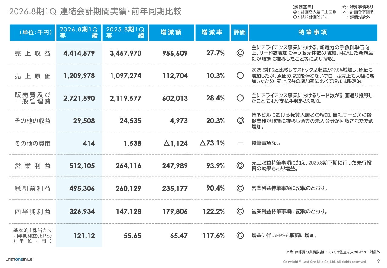 スライドでは、決算ハイライトについて、より詳しく記載しています。スライドの右側に評価と特筆事項を記載しています。売上収益に関しては、アライアンス事業のM&A効果などが寄与し、大幅に増加しており、評価は「◎(二重丸)」としています。