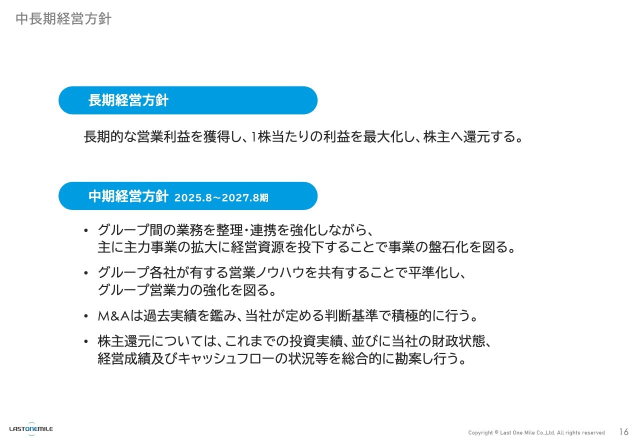 弊社の成長戦略についてです。「長期的な営業利益を獲得し、1株当たりの利益を最大化し、株主へ還元する」という方針は変わっていません。