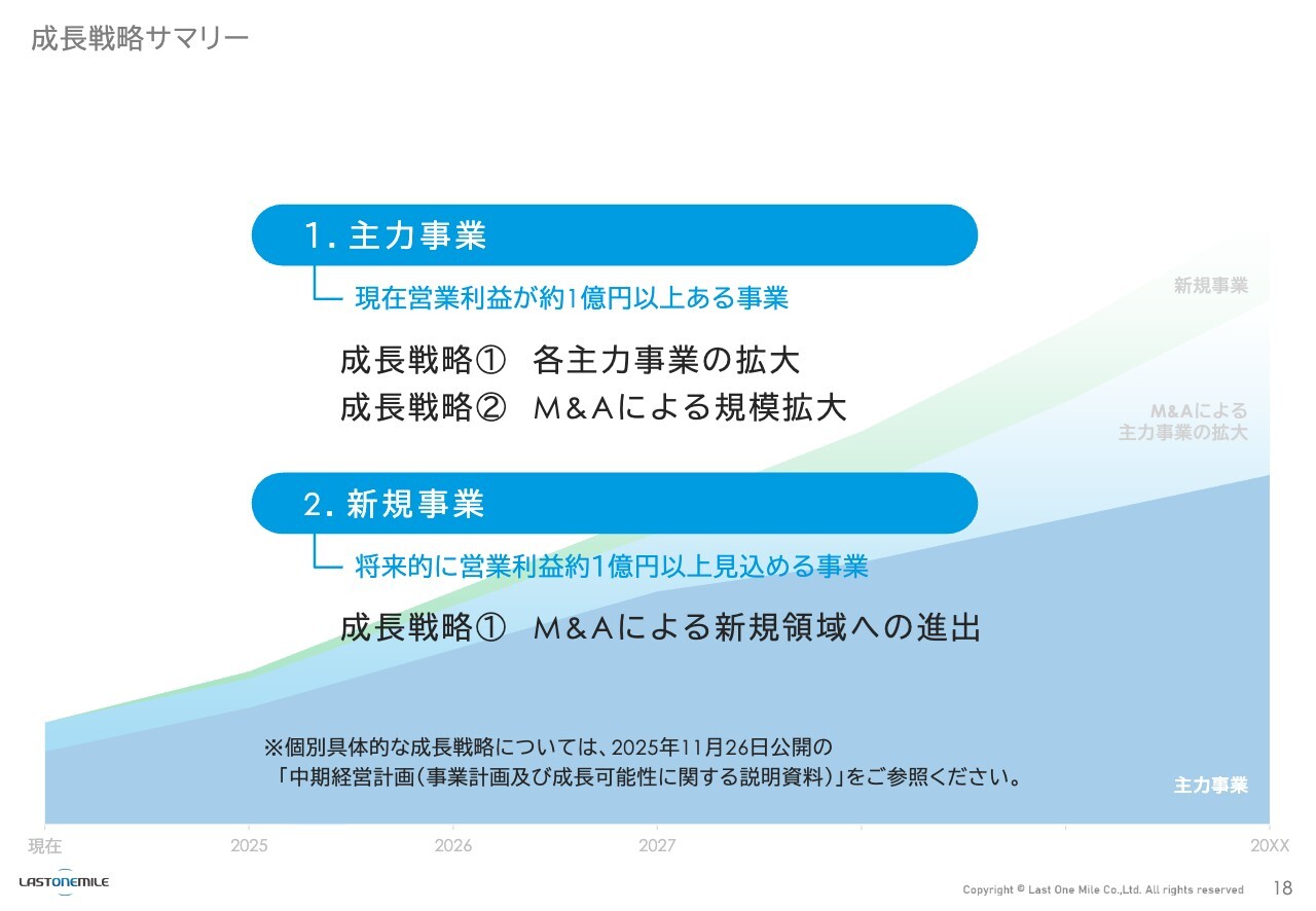 成長戦略サマリーです。成長戦略は引き続き、主力事業の拡大とM&Aを軸に進めたいと考えています。