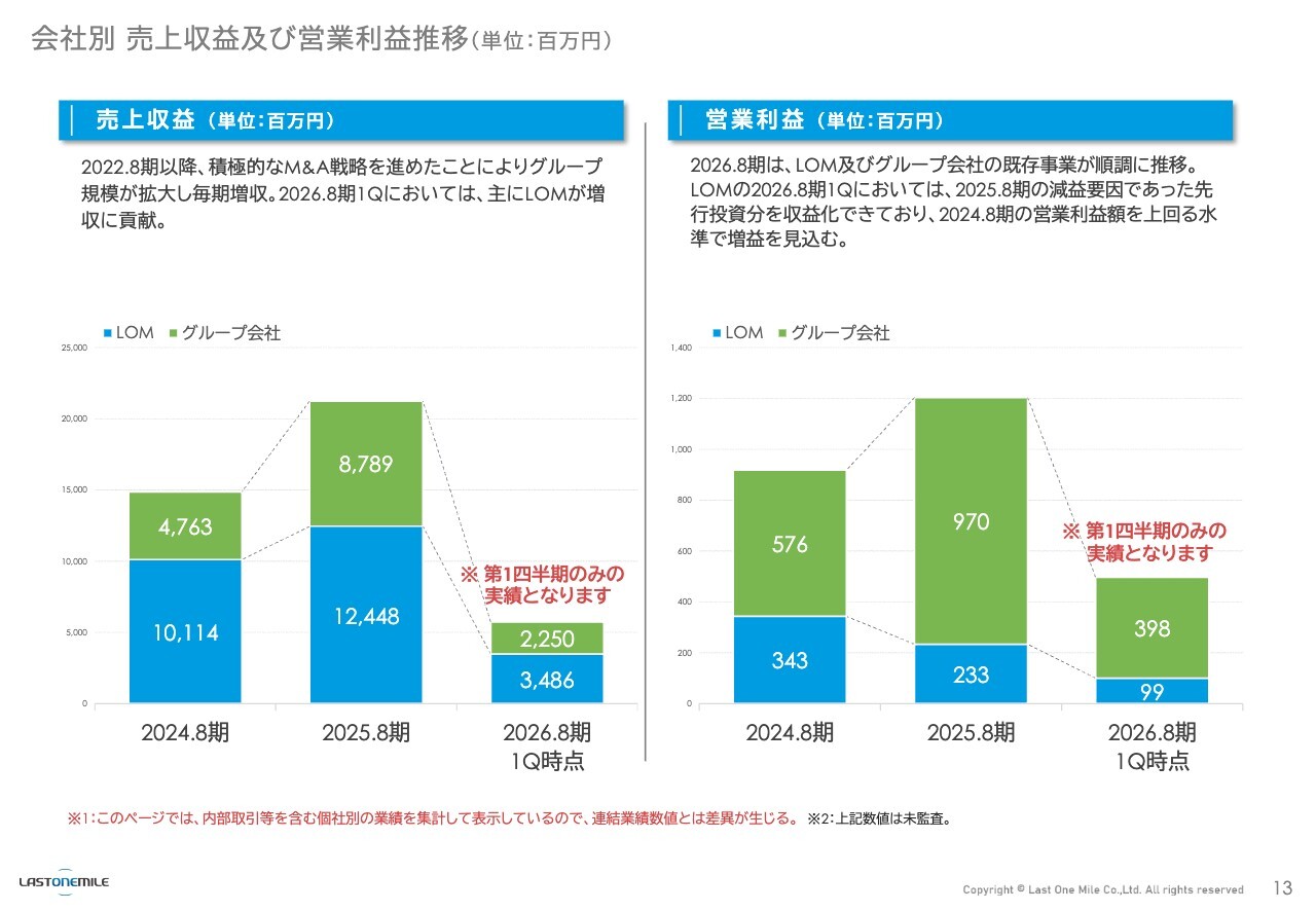 スライドは、ラストワンマイル(LOM)自体とその他のグループ会社との比較です。売上収益は伸びており、特に問題はありません。ただし、営業利益に関してよく聞かれるのが「ラストワンマイル自体が2025年8月期は少しへこんでいるじゃないか」という点です。