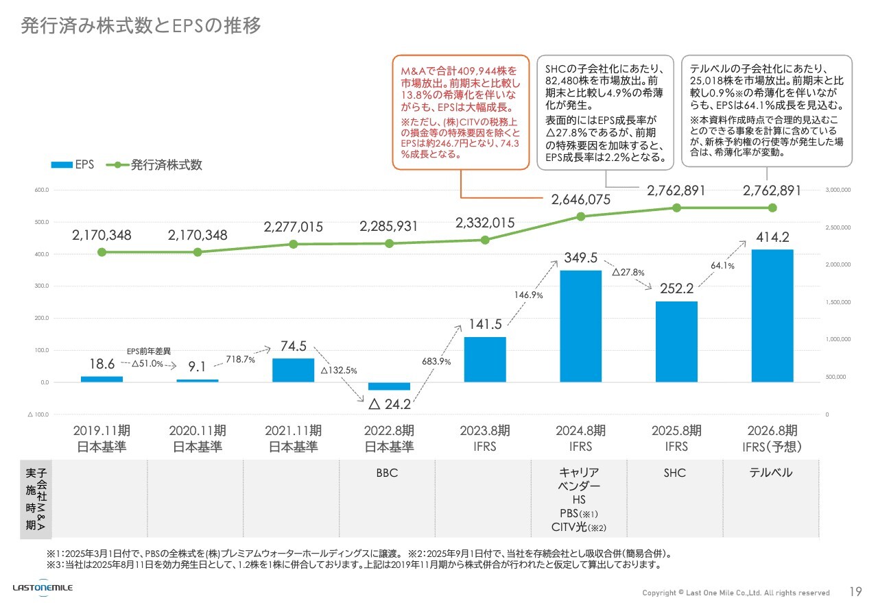 発行済み株式数とEPSの推移です。投資家の方から「EPSの推移を出してほしい」という要望もありました。弊社でも1株当たりの利益を意識しています。M&Aを進める際も、一時的に下がったとしても次にきちんと上がっていくような買収を行っています。