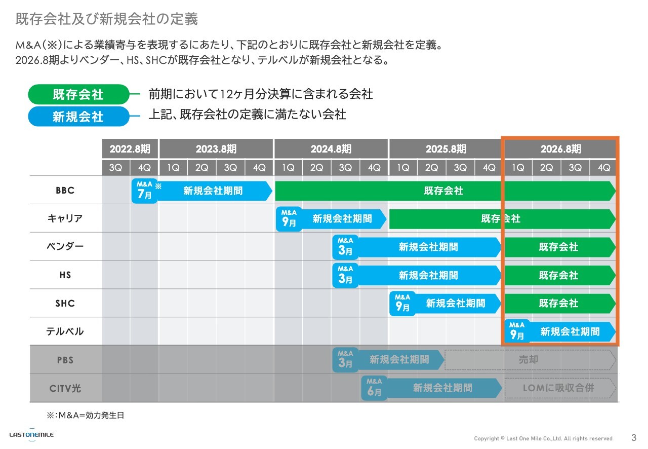 弊社には複数のグループ会社が存在します。これらを「既存会社」と「新規会社」に分けて定義しています。前期において12ヶ月以上の決算期間に含まれる会社を「既存会社」、それに満たない会社を「新規会社」としています。