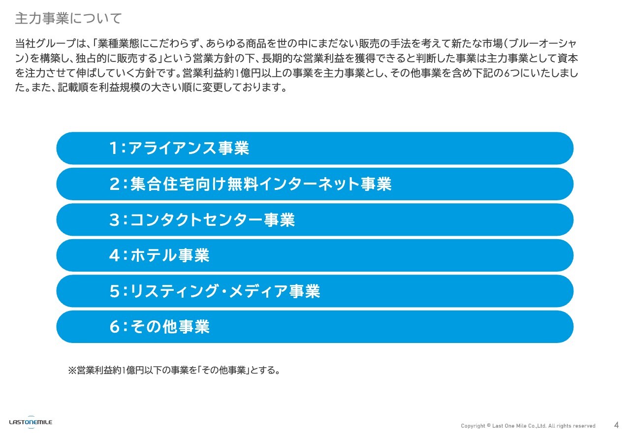 スライドには主力事業をその他を含め6つ挙げています。営業利益約1億円以上の事業を主力事業として定義しています。