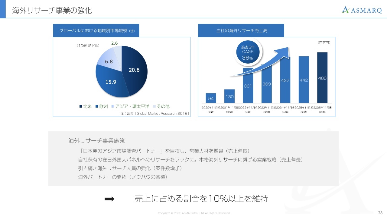 右上の棒グラフは、当社の海外リサーチ事業の売上高を示しています。2025年11月期は国内リサーチ事業に人員を集中させすぎた結果、海外リサーチ事業の成長がやや停滞しました。しかし、国内市場の10倍から20倍の規模を持つ市場において、グローバルチームを中心にさらなる成長を推進していく予定です。