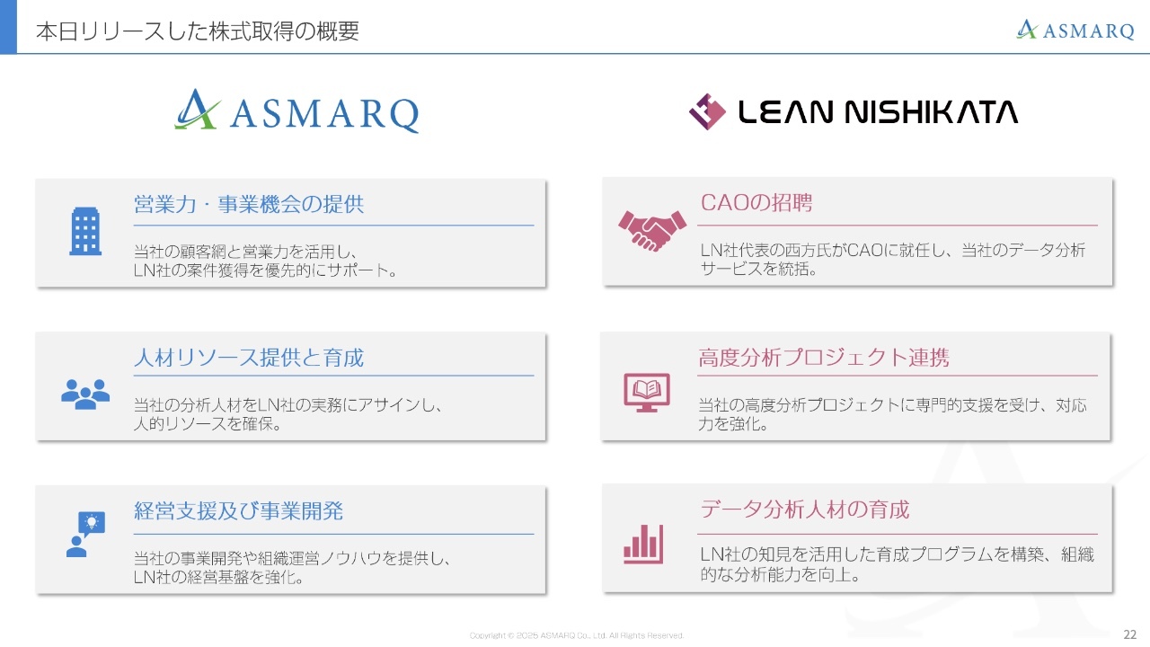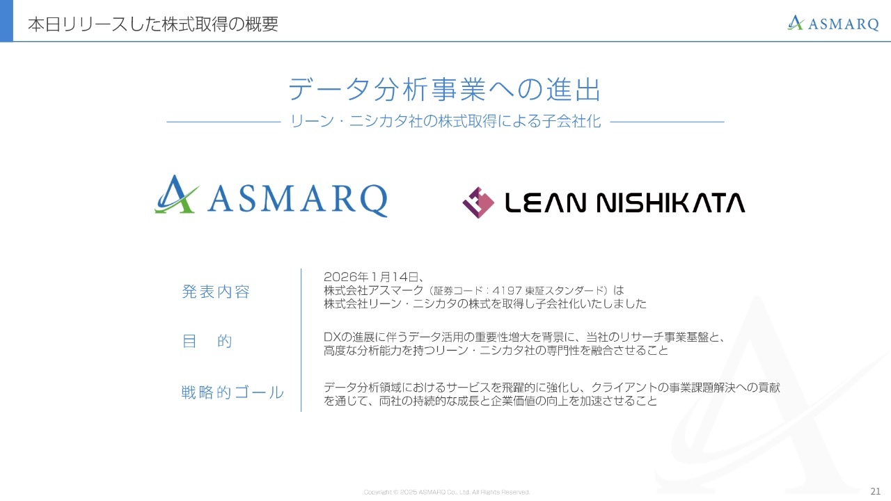 先ほど、データ分析事業への進出について少し触れましたが、1月14日にリーン・ニシカタという会社の株式を取得し、子会社化しました。当社は創業以来24年間、主力であるマーケティングリサーチ事業に注力してきましたが、新たな柱となるデータ分析事業をスタートします。