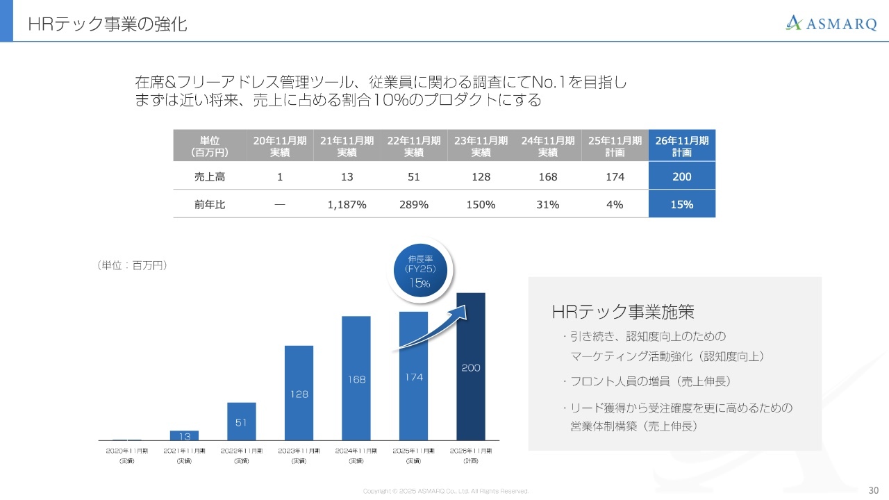 HRテック事業の強化についてです。2025年11月期までは少人数で効率的な営業を目指し、3名体制で行っていましたが、今期は勝負の年と位置づけ、営業担当を3名から7名へと大幅に増員しました。また、広告費も前年に比べて約1.5倍に増加させています。