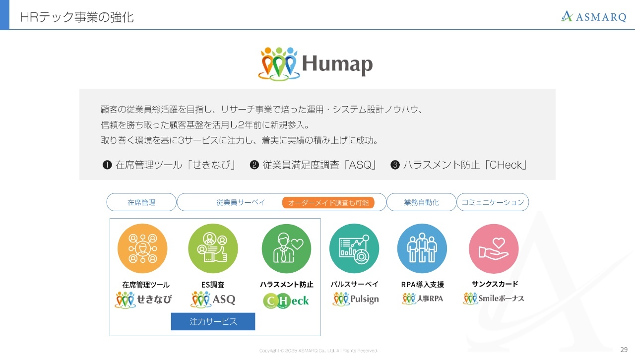 「Humap」については、スライドに記載の計画で進めていきます。また、HRテック事業は自力での成長に加え、M&Aやアライアンス、業務提携などで相性の良い会社を探しているところです。私としては、早期に売上高10億円の壁を越えたいと考えています。