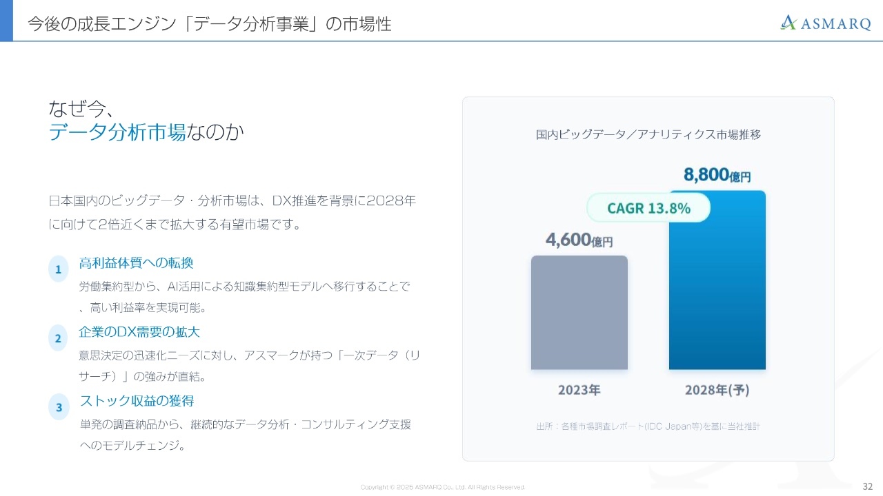 飯田:今後、私たちはデータ分析事業に注力していきます。市場環境については、スライド右側のグラフにあるとおり、国内のデータ分析市場はDXの進展によって、2028年に向けて現在の約2倍となる8,800億円規模へと急拡大する見通しです。